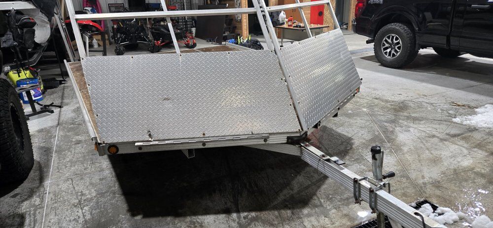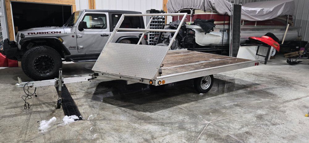 VenmoThis is a great trailer! Brand new wheels and tires, haul two snowmobiles with almost any vehicle. You can move the trailer around very easily by hand. All LED lights work. Wheel bearings serviced recently. Drive on drive off.