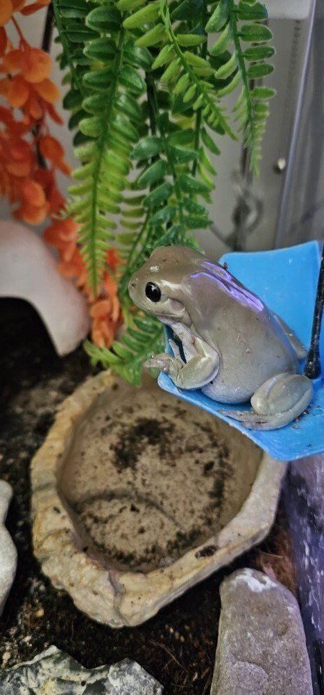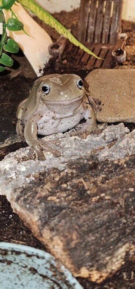 VenmoThis is Frogger, pretty sure this is a female. Frogger is a beautiful little frog with a great personality. He/she is about a year old. Australian whites tree frogs can live 15 to 20 years in captivity if taken care of properly. They're fun and simple pets. Frogger would come with her full set up including heat lamp and thermostat regulator, UVB lights, hexagon terrarium and everything inside.