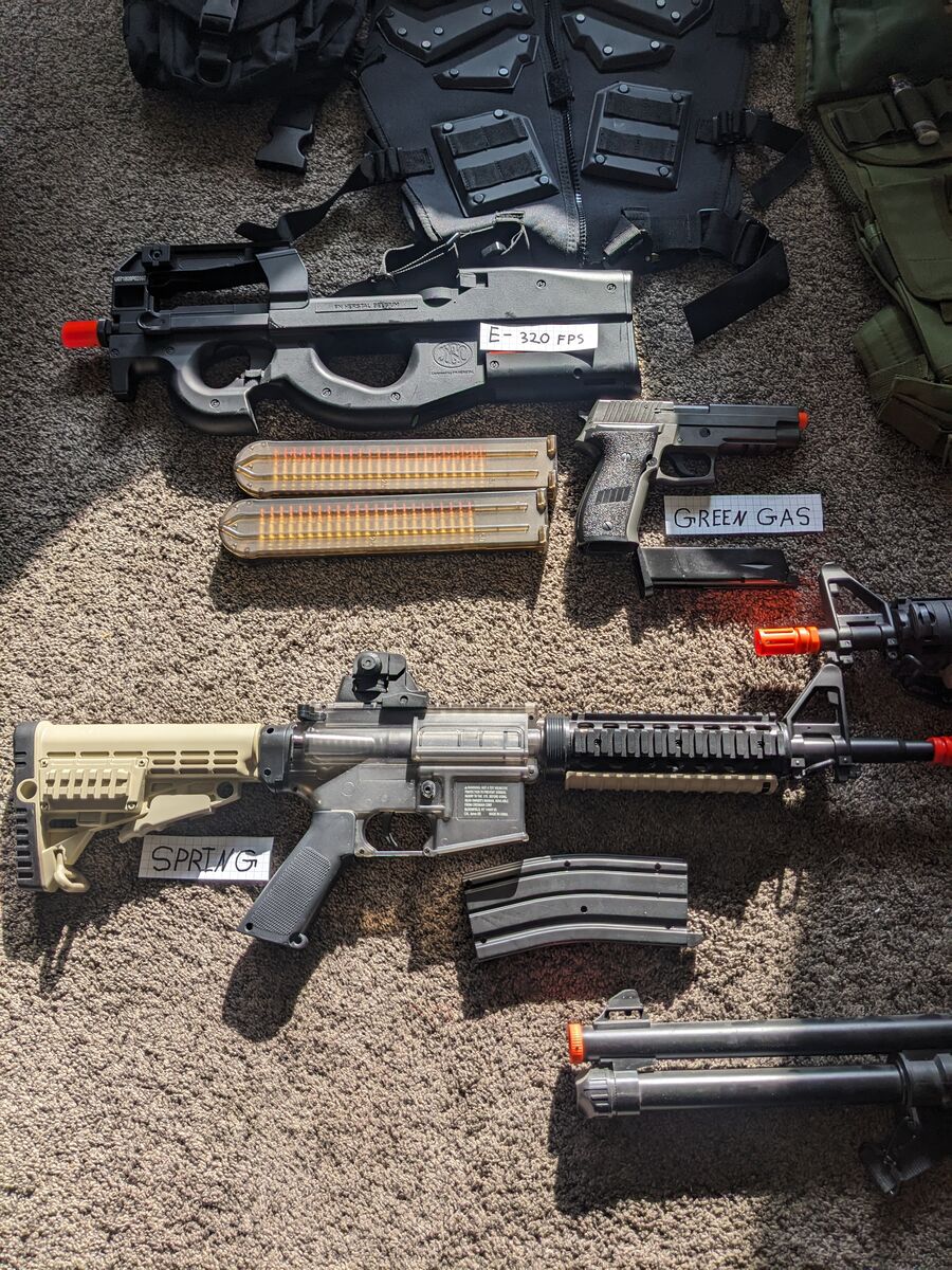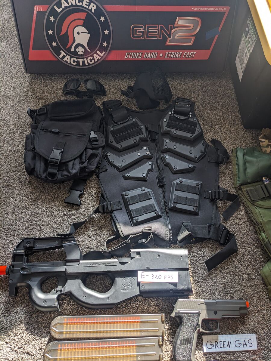 PayPalLoad out for 2+ people. 3 rifles, 1 shotgun, two handguns. Two masks, two vests, one side pouch. Extra mags, 6mm BB's, green gas canister, one box of CO2. Tote box included.