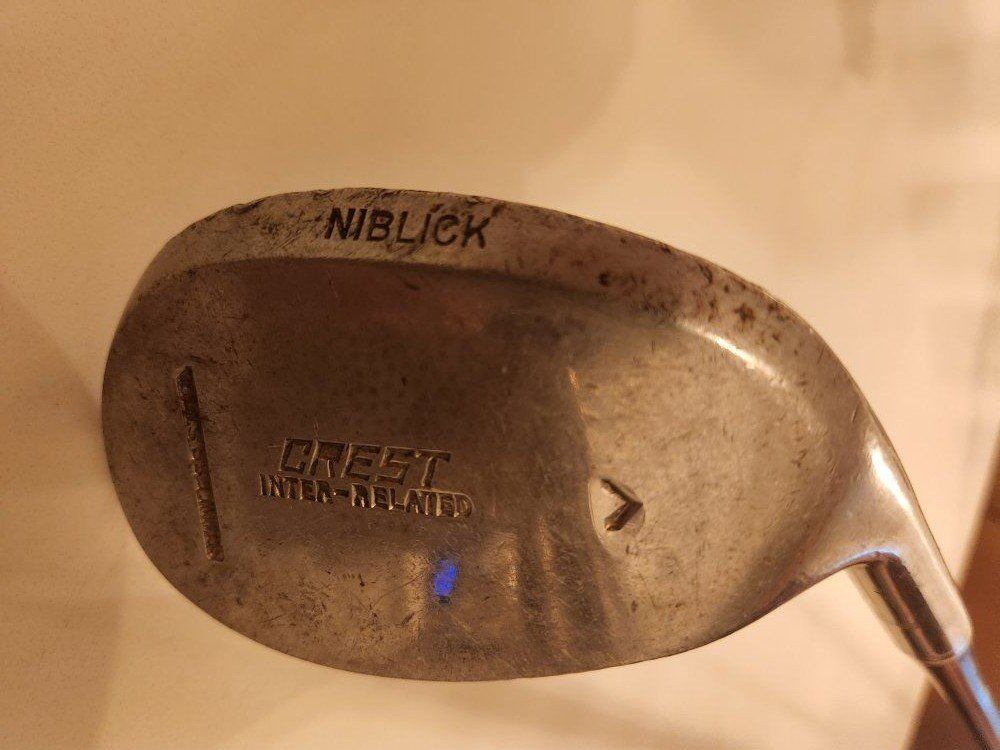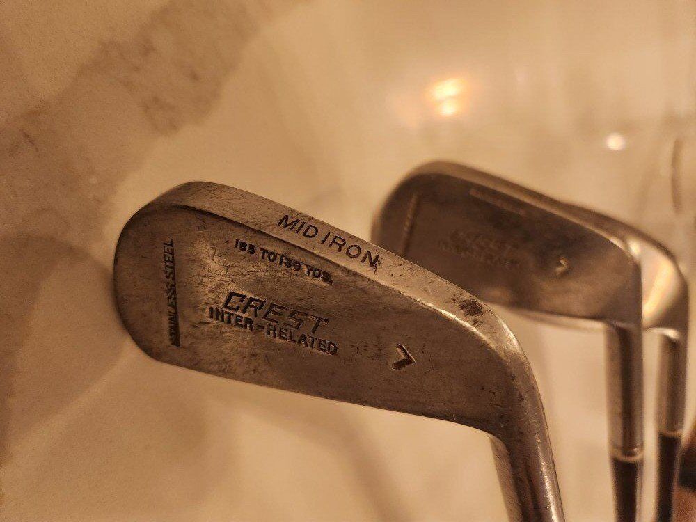 VenmoVintage Crest Inter-Related Iron Set. Includes a Mid Iron, Mashie and Niblick clubs. Stainless steel heads, composite shafts and leather grips. The faces are dotted and in fair condtion. See photos for more details. $60.00 for the set.