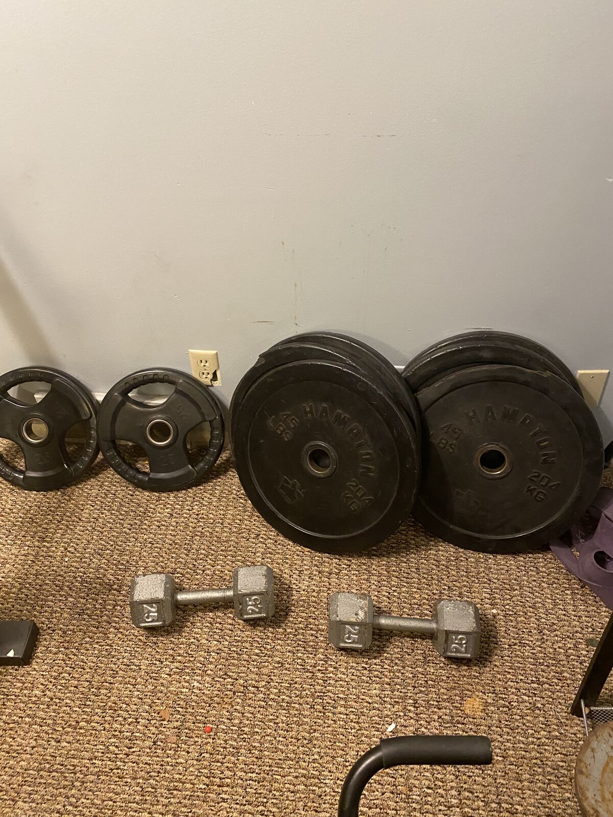 Bench press with bar. Six 45 lb plates. Two 25 lb. Two 10 lb. Two 5 lb. And two clips. Still brand new only used a couple times. Only selling because I don't need it anymore.