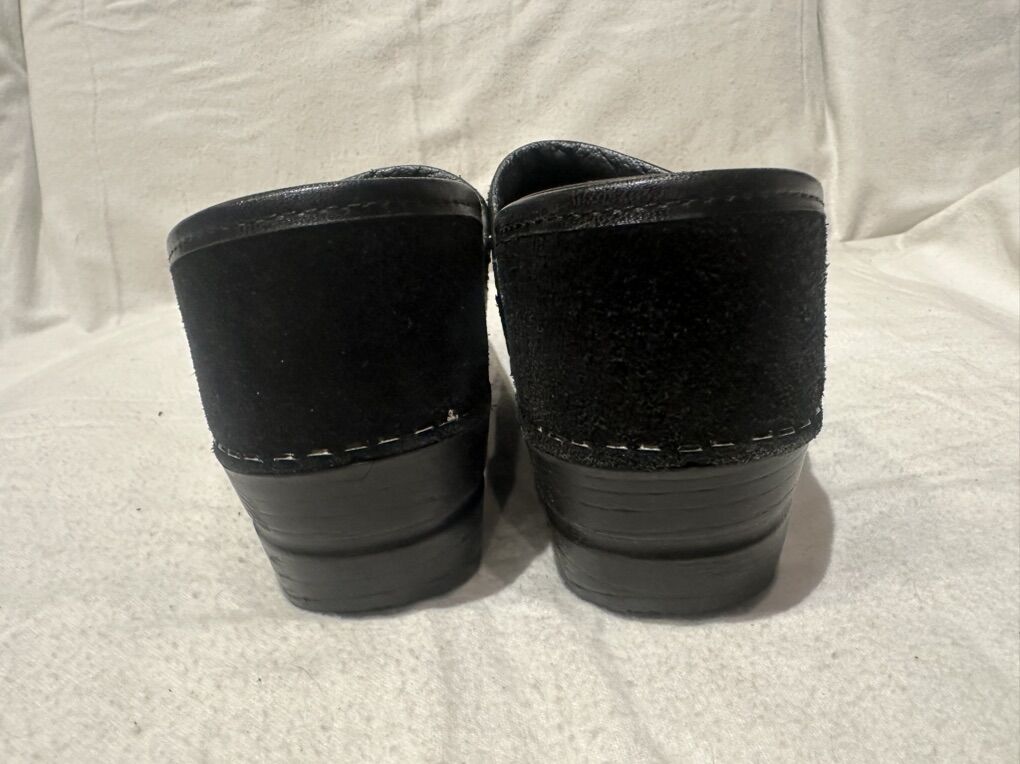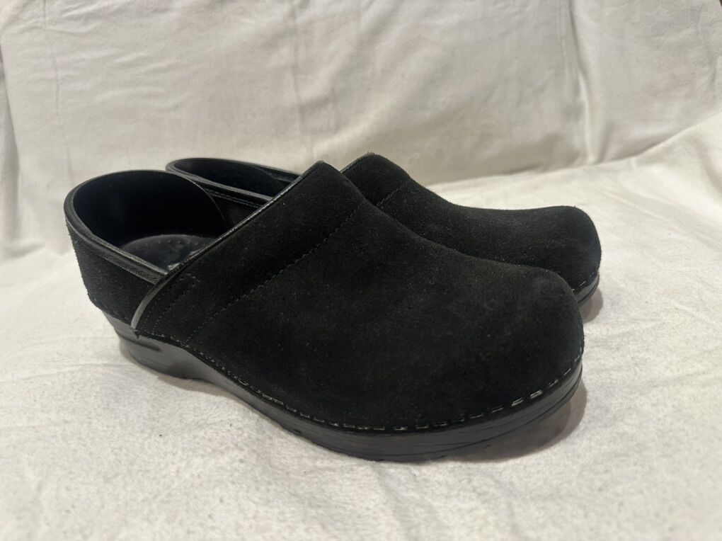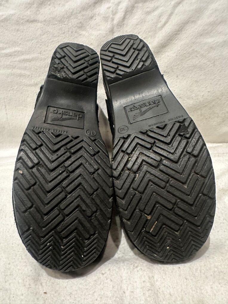 Dansko EU 38 or US women’s size 7.5 black suede clogs. These are in good condition, see photos for details. I take cash or Venmo, but cash is preferred. Text is best. 801-201-4446. Check out my other answers for additional sizes and styles.