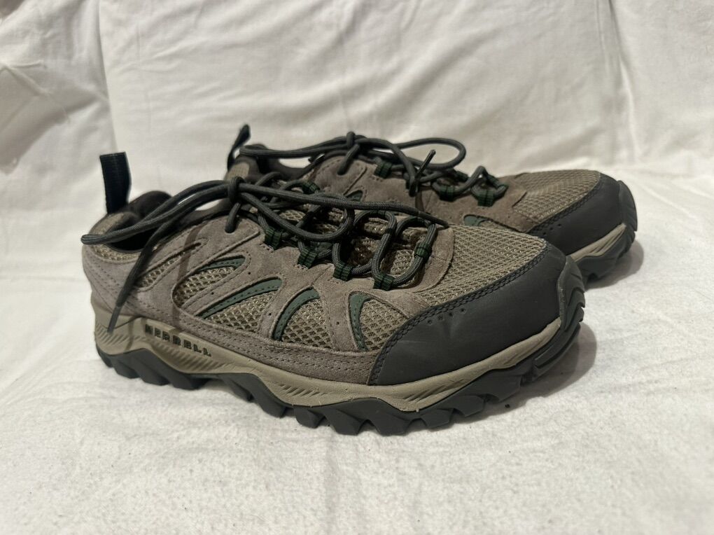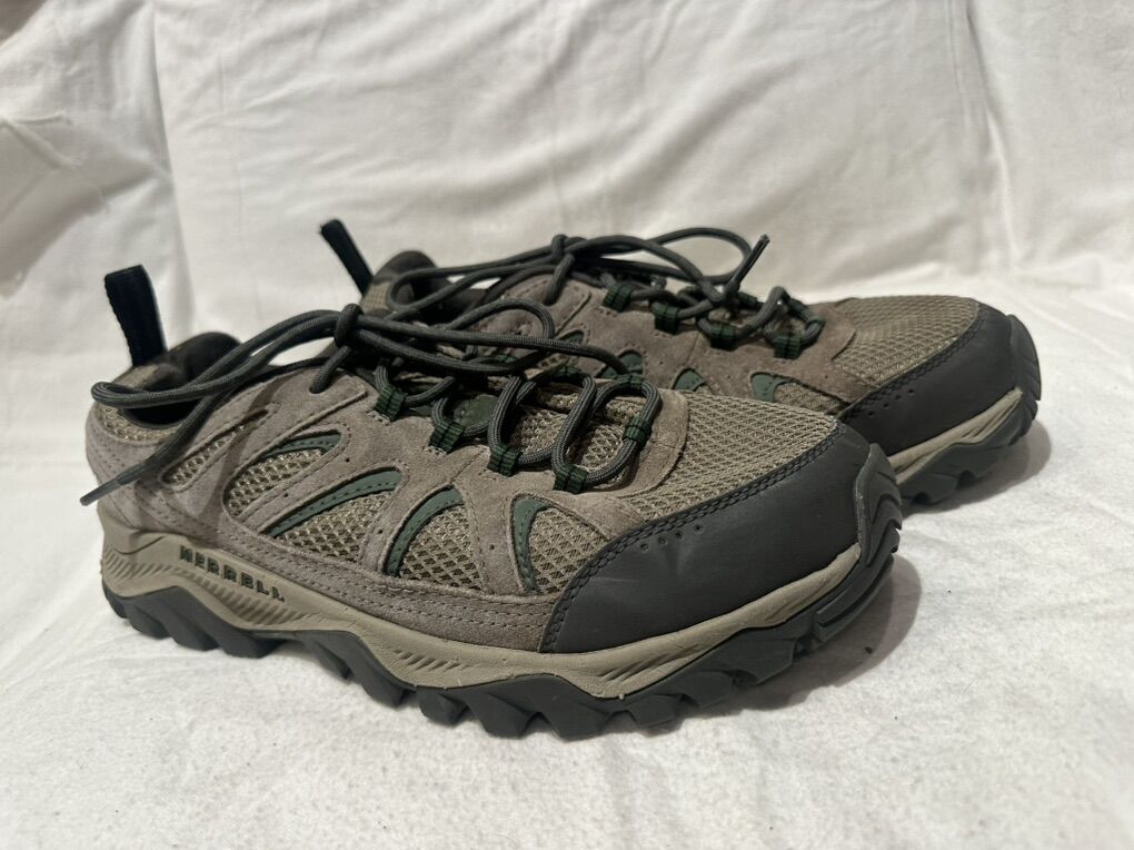 Merrell men’s size 10.5Wide beige with green trim, mesh and leather hiking shoes. These are in good condition, see photos for details. Model number J03537W. I take cash or Venmo, but cash is preferred. Text is best. 801-201-4446. Check out my other ads for additional sizes and styles.