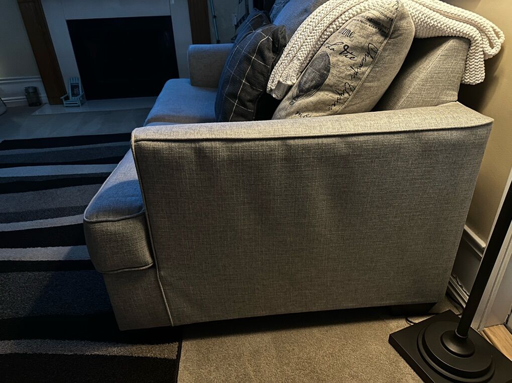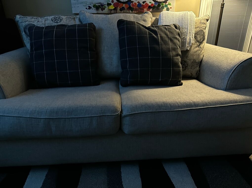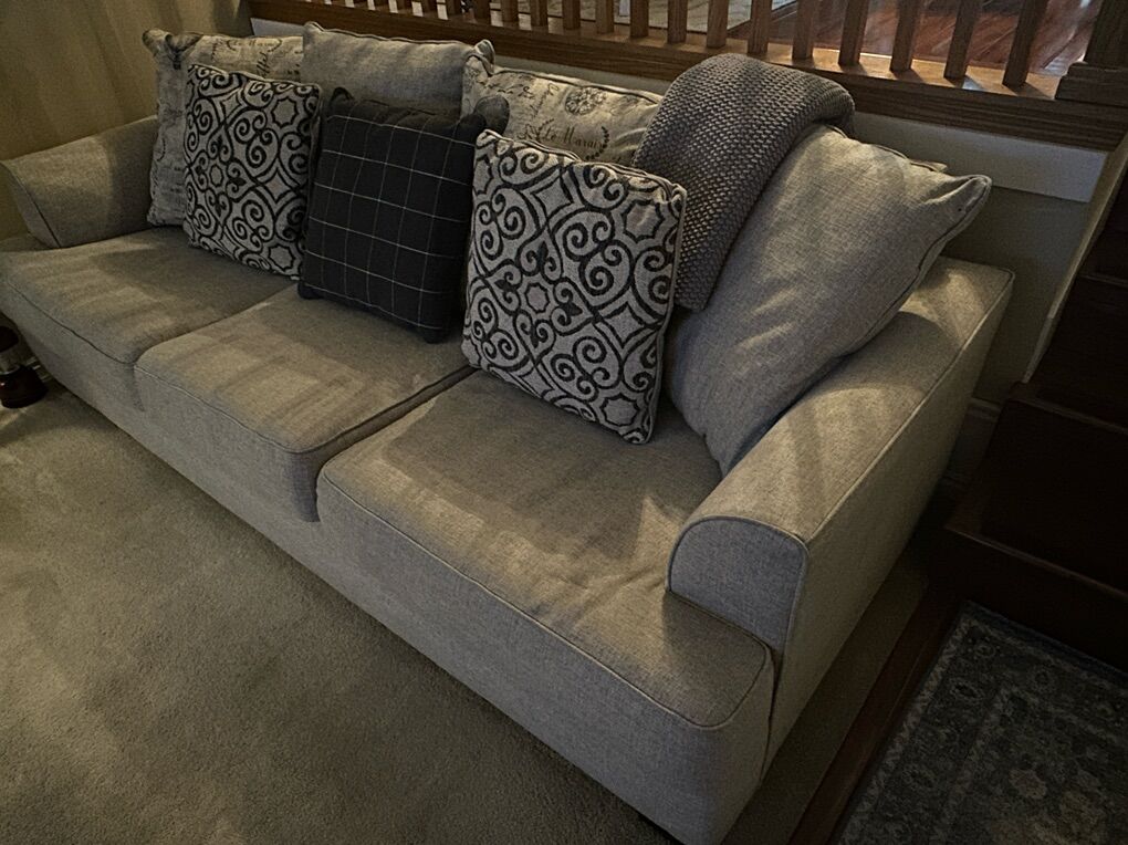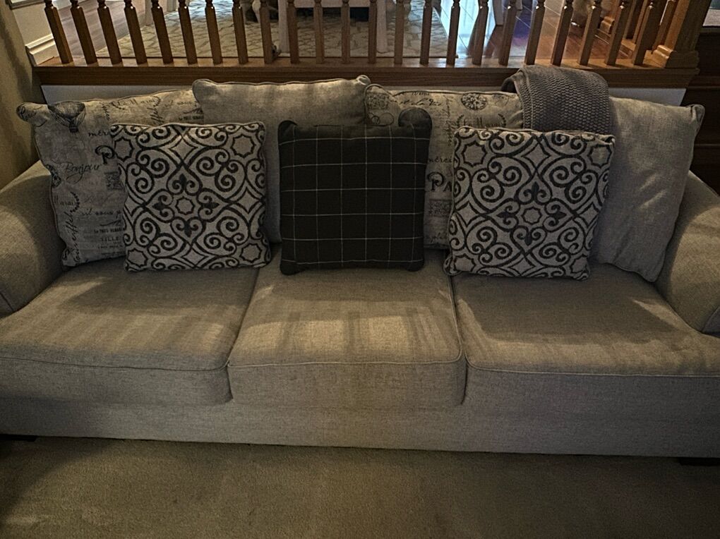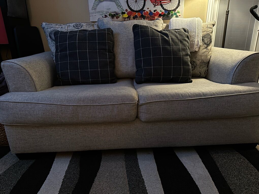 ZelleA set of 3 couches bought from Ashley furniture (includes main 3 seater sofa, a 2 seater sofa and an armchair) light gray in color, and in great conditions (no rips or tears)