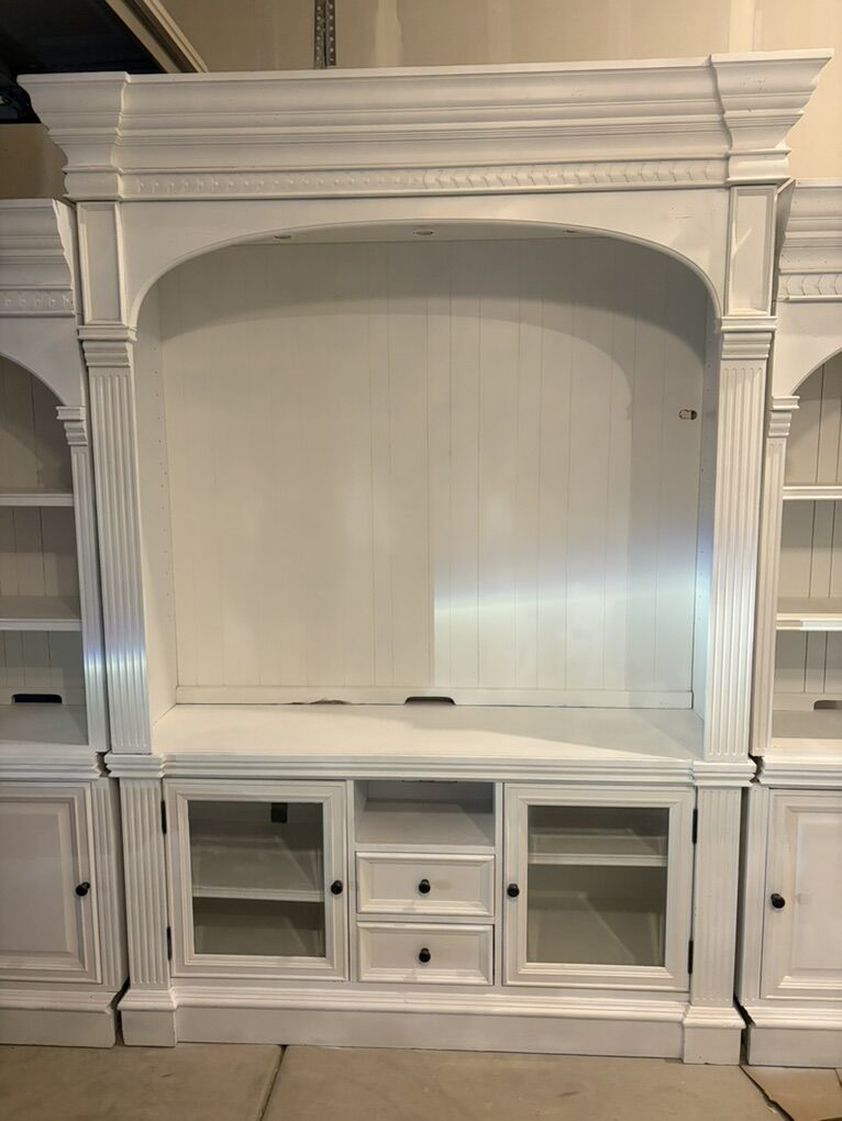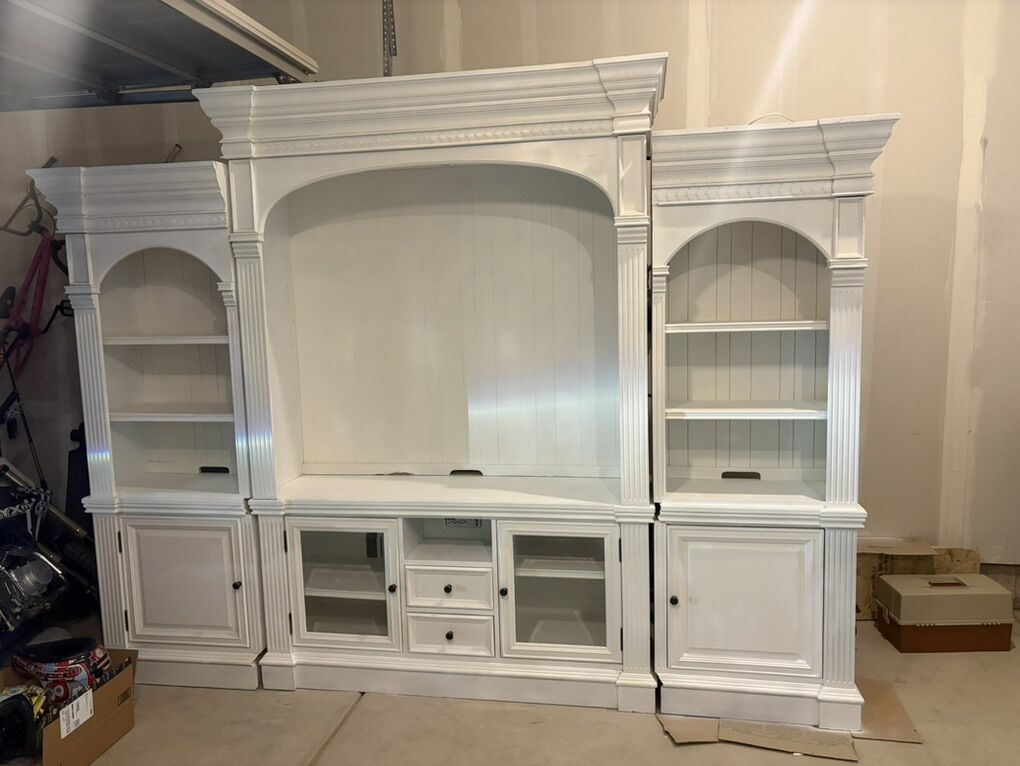 ApplePayThis 4 piece entertainment center is looking for the right home. The center pieces are 62 inches long and side pieces are 28 inches each totally 118 inches long. It should be able to fit at least a 65 inch tv.