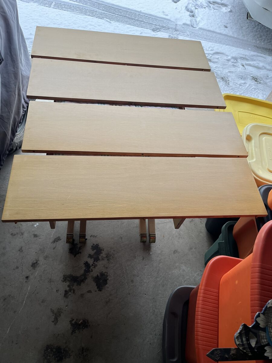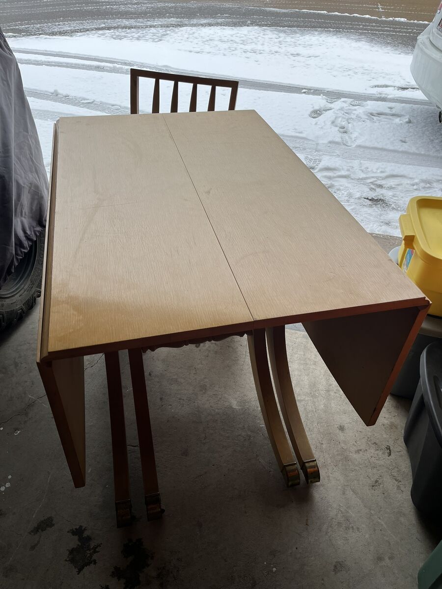 Solid oak dinning room table: width 42", length 58", height 30". Includes 4 table leaves; each 12" x 42" for an additional 48" of table length, includes 5 chairs and captains chair.