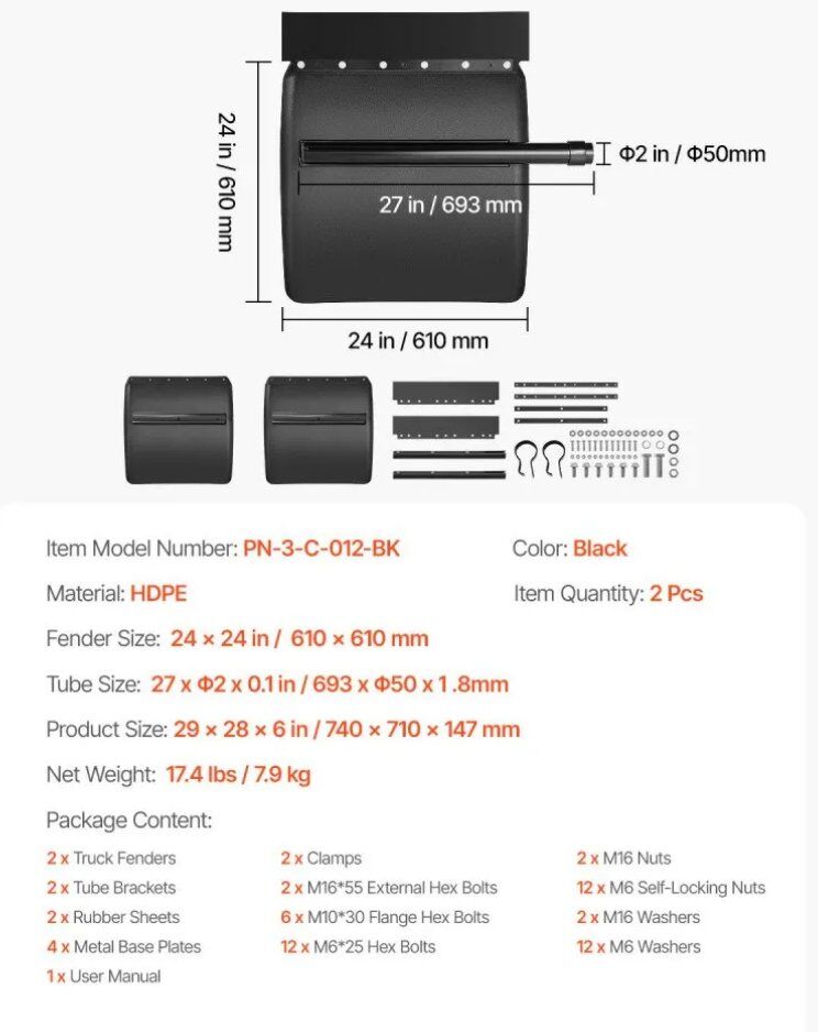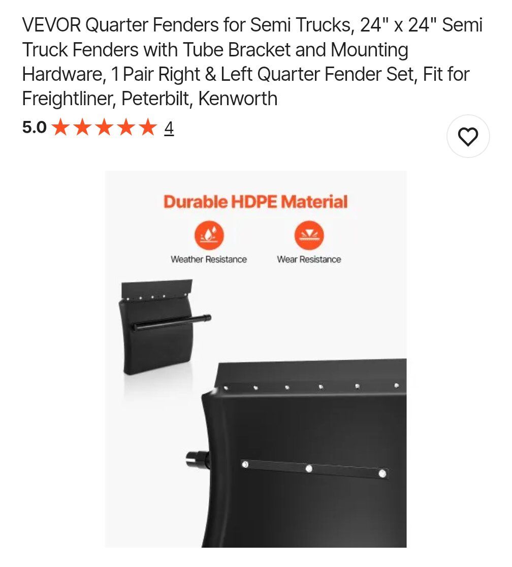 VenmoBrand new in the box VEVOR Quarter Fenders for Semi Trucks. 24" x 24" Semi Truck Fenders with Tube Bracket and Mounting Hardware included. 1 Pair Right & Left Quarter Fender Set for semi trucks including Freightliner, Peterbilt, Kenworth and more. Asking $45. Text if interested 801-903-8337