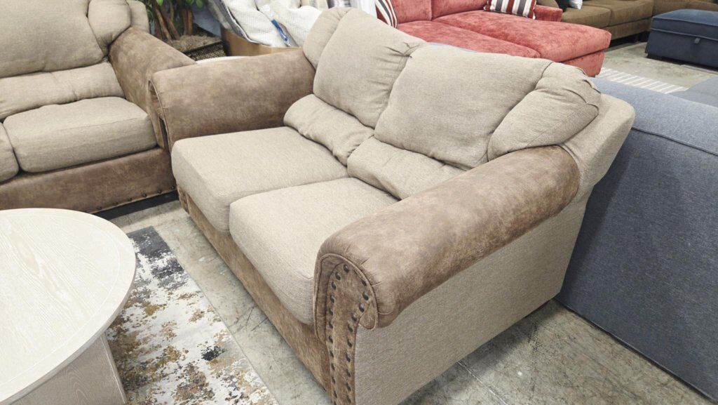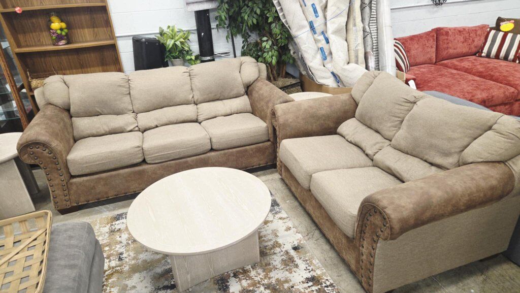 Beautiful brown and beige Sofa and Love seat set. Attached back seats, removable seat cushions. Beautiful rolled arms with nail head trim, microsuade fabric upholstery. Great condition. Sofa: 93"W X 41"D X 36"H Loveseat: 70"W X 41"D X 36"H Located in Layton.