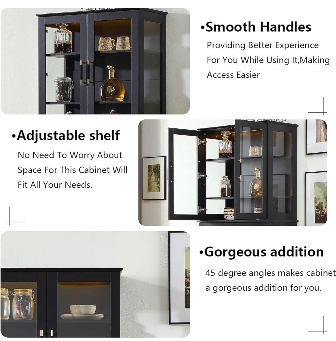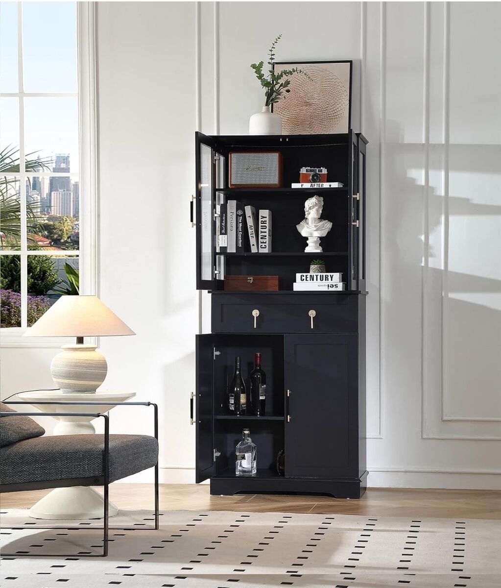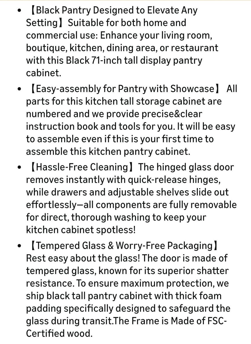 •Display Your Treasured Collections with EleganceTempered glass doors and side panels offer enhanced visibility, turning your rustic kitchen pantry into a dazzling showcase for fine china, luxury handbags, wine collections, or retail products. •Customizable Storage with Adjustable & Removable ShelvesEnjoy great flexibility with 3 adjustable shelves. Effortlessly remove them to create spacious compartments for tall vases, large appliances, or seasonal decorations. Reconfigure the layout in seconds as your storage needs change! •Black Pantry Designed to Elevate Any SettingSuitable for both home and commercial use: Enhance your living room, boutique, kitchen, dining area, or restaurant with this Black 71-inch tall display pantry cabinet. •Easy-assembly for Pantry with Showcase All parts for this kitchen tall storage cabinet are numbered and we provide precise&clear instruction book and tools for you. It will be easy to assemble even if this is your first time to assemble this kitchen pantry cabinet. •Hassle-Free CleaningThe hinged glass door removes instantly with quick-release hinges, while drawers and adjustable shelves slide out effortlessly—all components are fully removable for direct, thorough washing to keep your kitchen cabinet spotless! •Tempered Glass & Worry-Free PackagingRest easy about the glass! The door is made of tempered glass, known for its superior shatter resistance. To ensure maximum protection, we ship black tall pantry cabinet with thick foam padding specifically designed to safeguard the glass during transit.The Frame is Made of FSC-Certified wood.