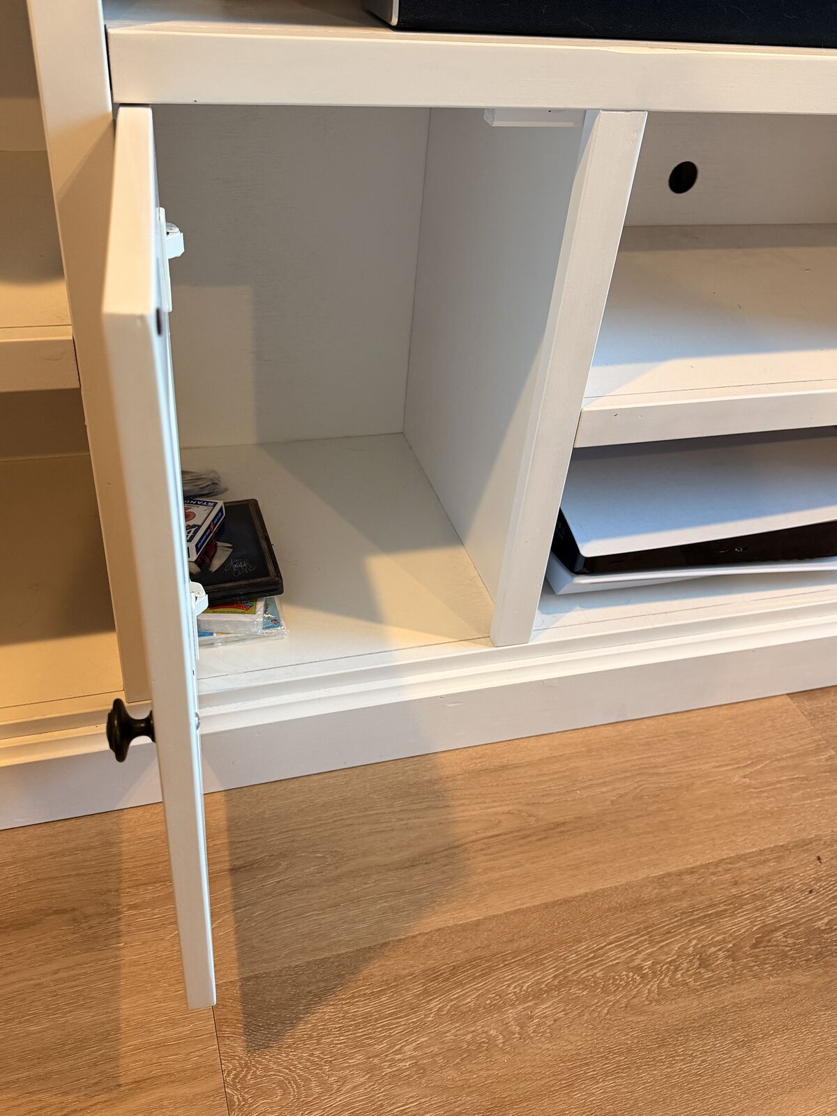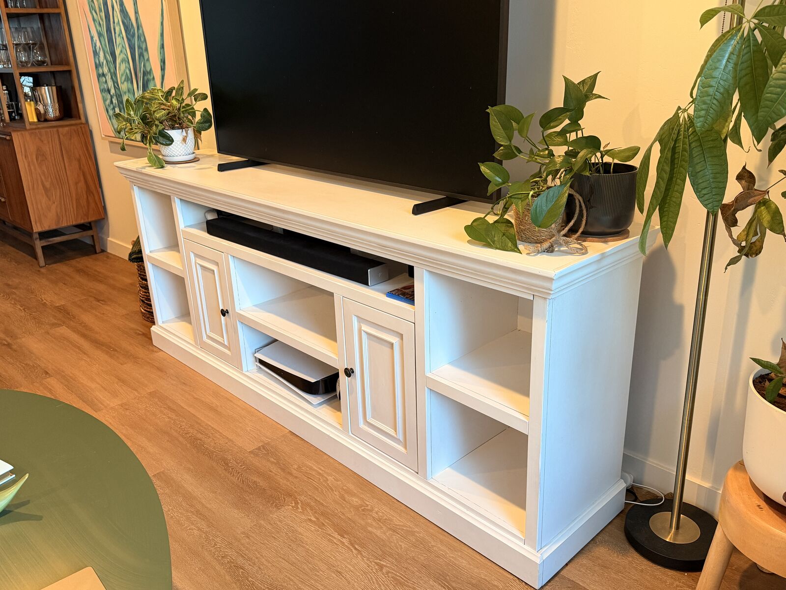 Solid wood media console / TV console in excellent condition. Very sturdy, heavy, and high-quality — built to last. • 87 inches long x 18 inches depth • Built in shelves are 16 1/2 depth • Solid wood construction (not MDF or particle board) • Painted white finish • Multiple shelves and cabinet storage • Fits large TVs comfortably