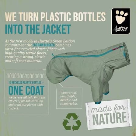 DESCRIPTION: This is a top-tier raincoat for active dogs who don't let a little weather stop them. The Hurtta Rain Blocker ECO combines the full protection of an overall with the ease of putting on a standard coat. Made from 100% recycled plastic bottles, it is incredibly durable, waterproof, and breathable. The Hedge green color is highly visible and looks great on all breeds.