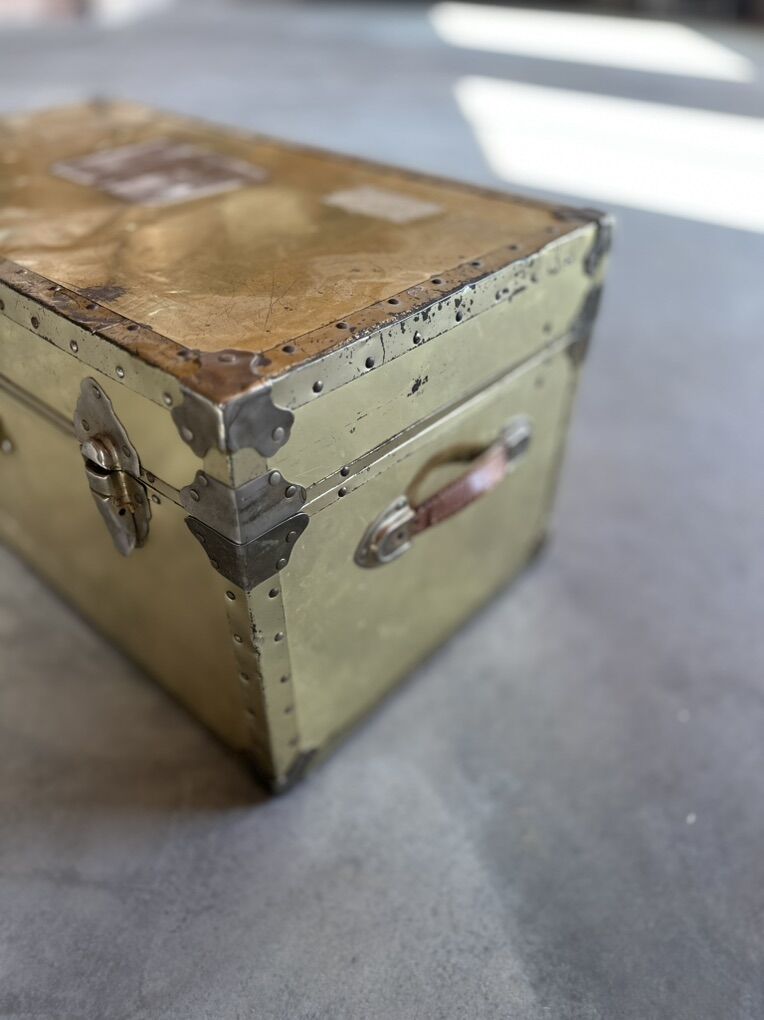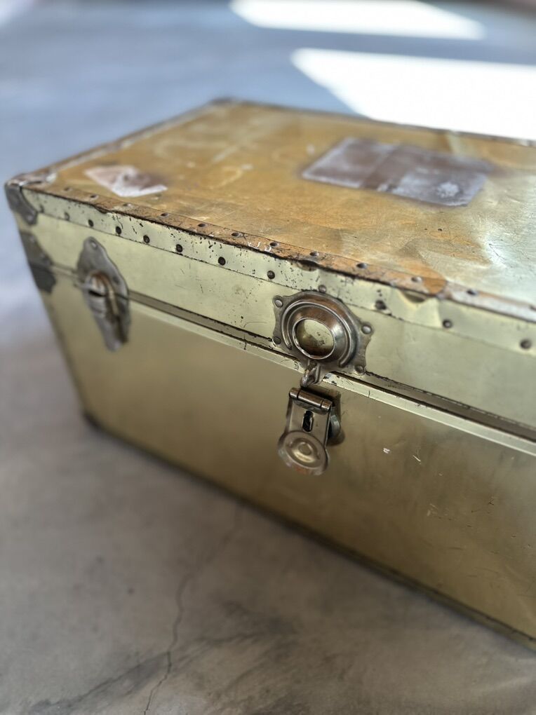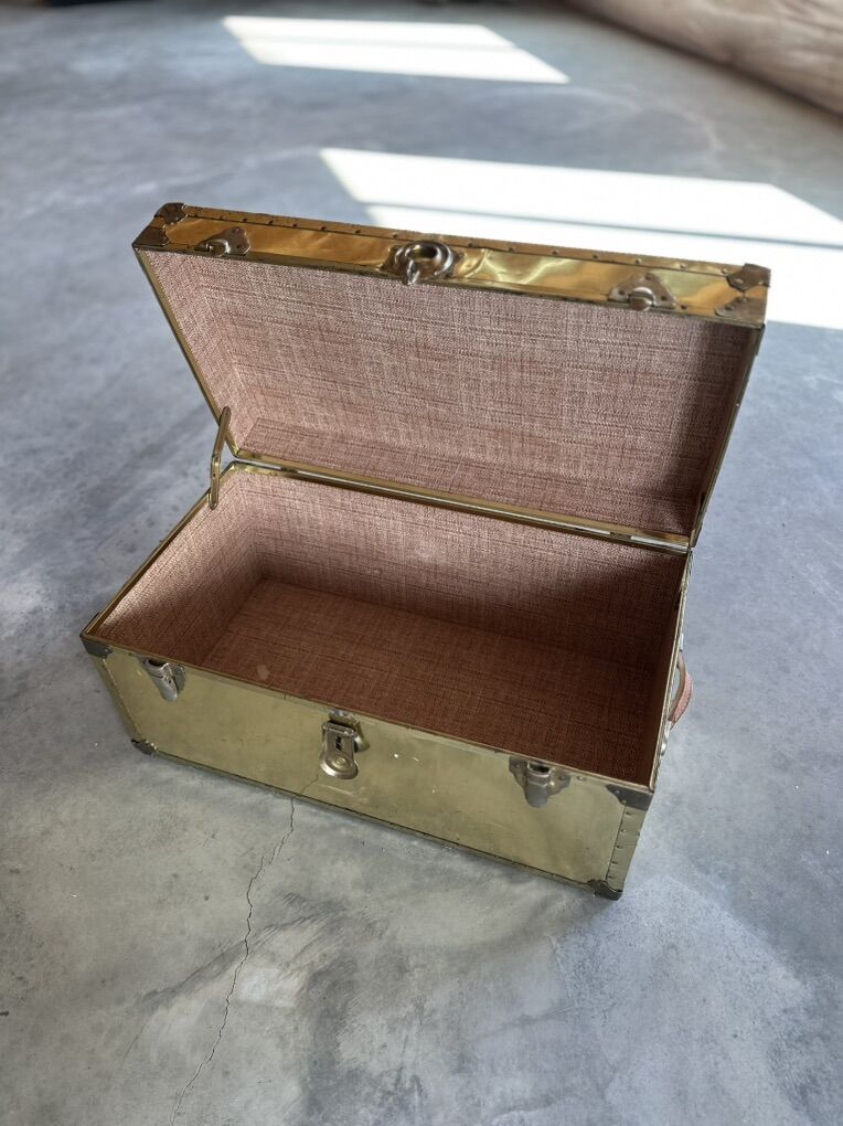 DESCRIPTION: This is a classic Seward footlocker, a staple of American travel history for over a century. Featuring a striking brass exterior with reinforced corners and heavy-duty hardware, this trunk is as functional as it is decorative. It’s perfect as a unique coffee table, end-of-bed blanket storage, or a vintage-themed treasure chest for a nursery or playroom.