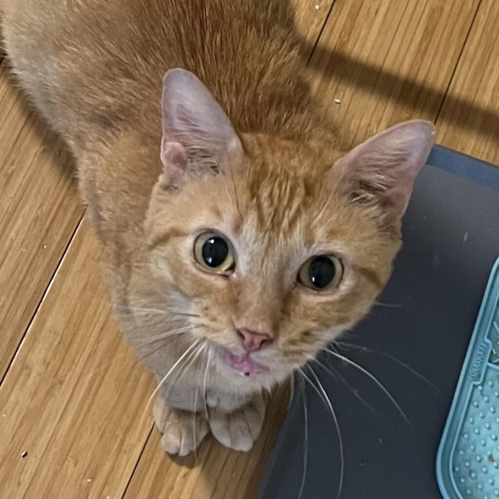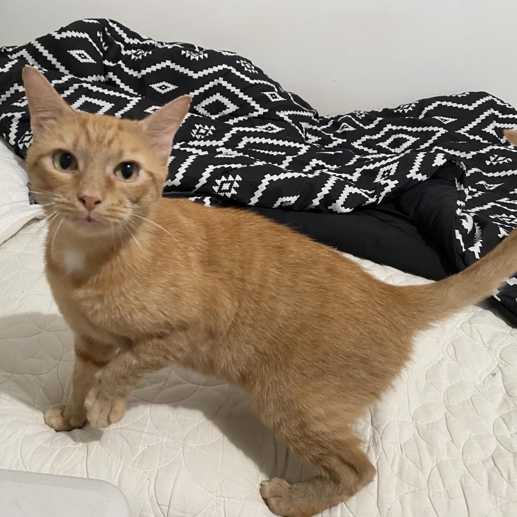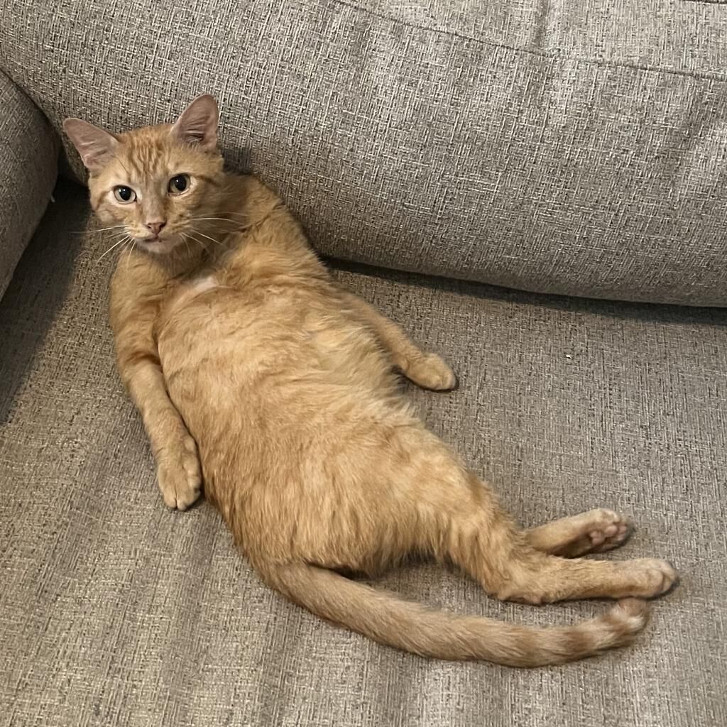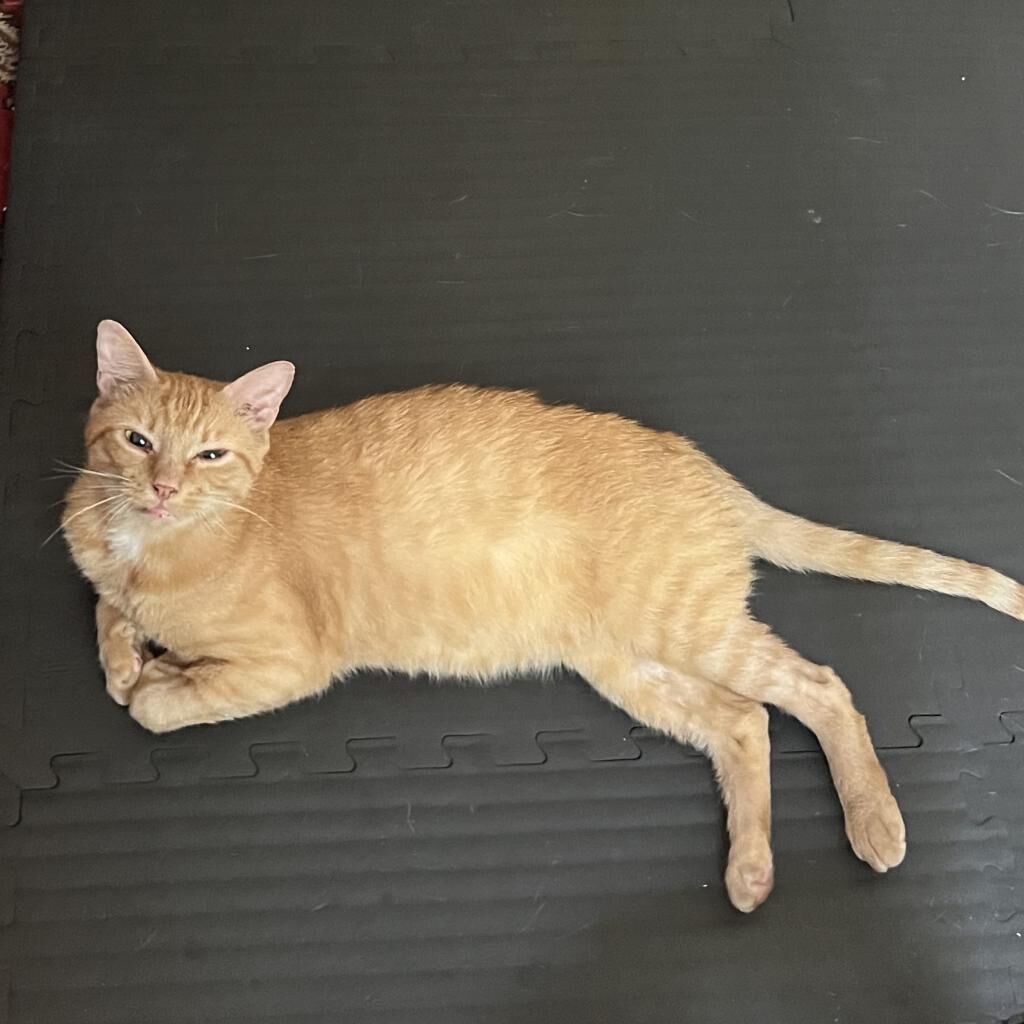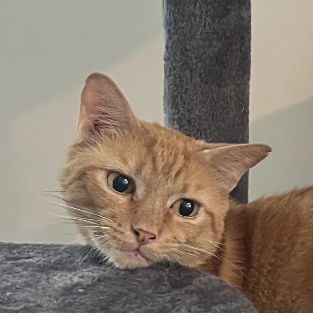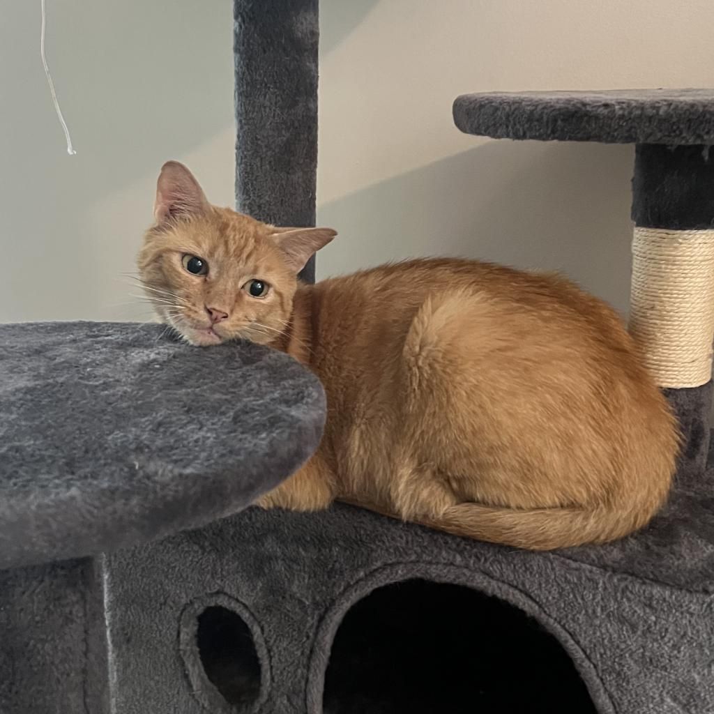 Introducing Mogli, a vibrant 4-year-old male orange tabby! Mogli is bright and sunny with a playful and energetic personality that's sure to bring joy to any household. He loves to chase toys, explore new spaces, and bask in the warmth of the sun streaming through the window. Despite his playful nature, Mogli also enjoys quiet moments of affection and will happily snuggle up with you for cuddles and pets. He is curious, relaxed, quite vocal when he wants something, and affectionate. He likes to play with toys that emulate hunting. He goes bonkers over a stick and string toy with some bait on the end and is fascinated by movement like fans and blowing air. He likes to squeeze himself into tight spaces. He likes to chat, and is a wonderful companion. Mogli loves both to play and receive pets. He will play by himself but also likes you to be involved. He also loves being pet and will come sit next to you or follow you around to ask for pets. He is a loyal and constant companion, you could not ask for a better friend.