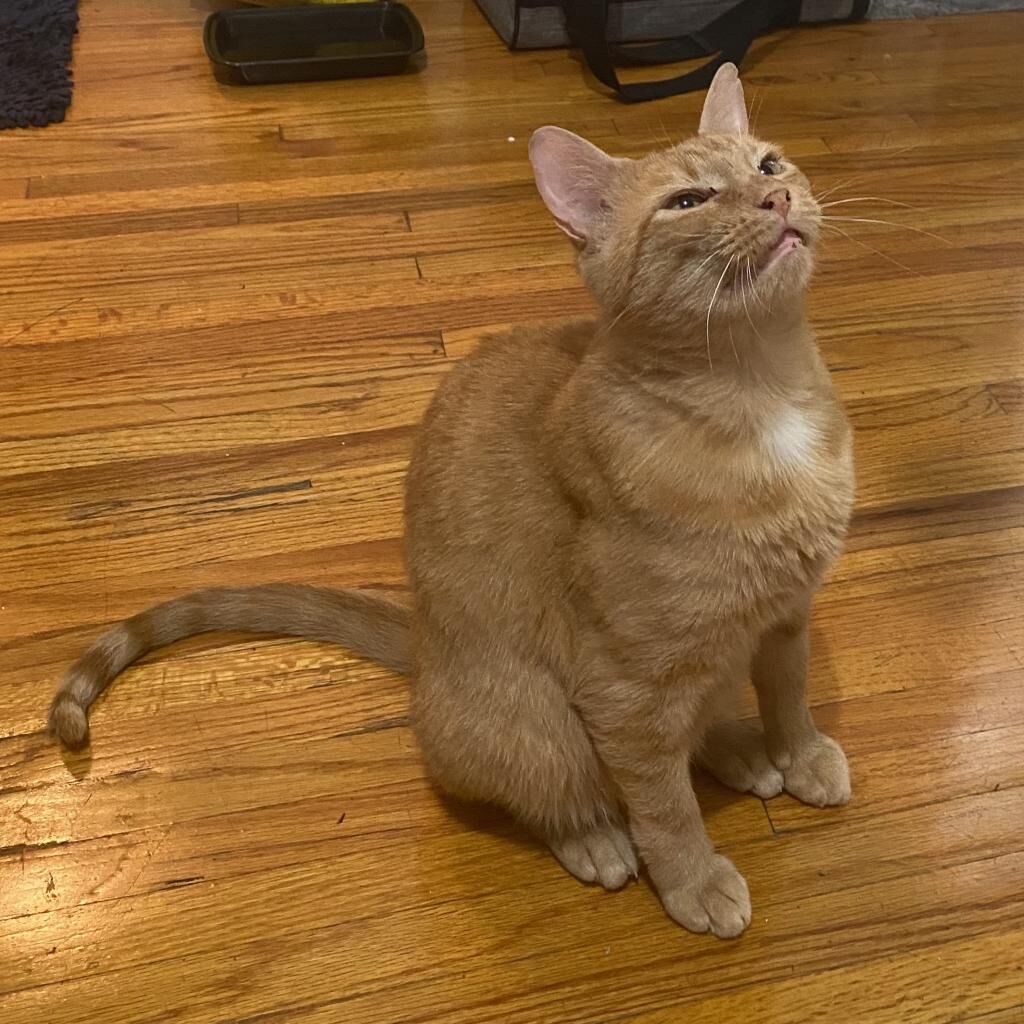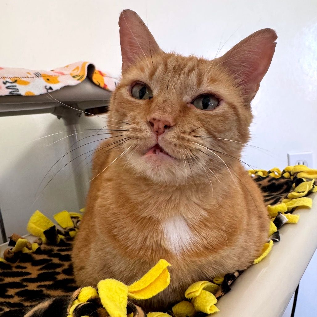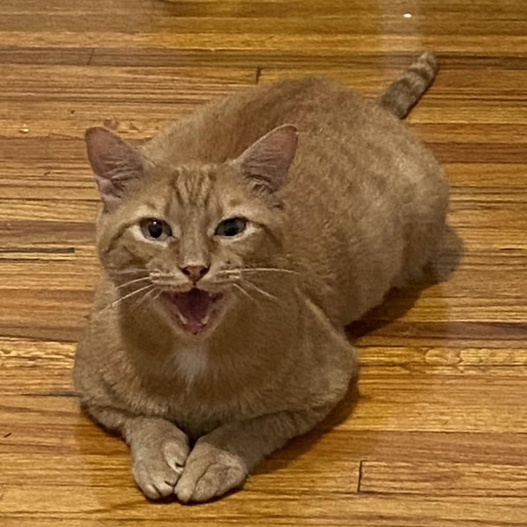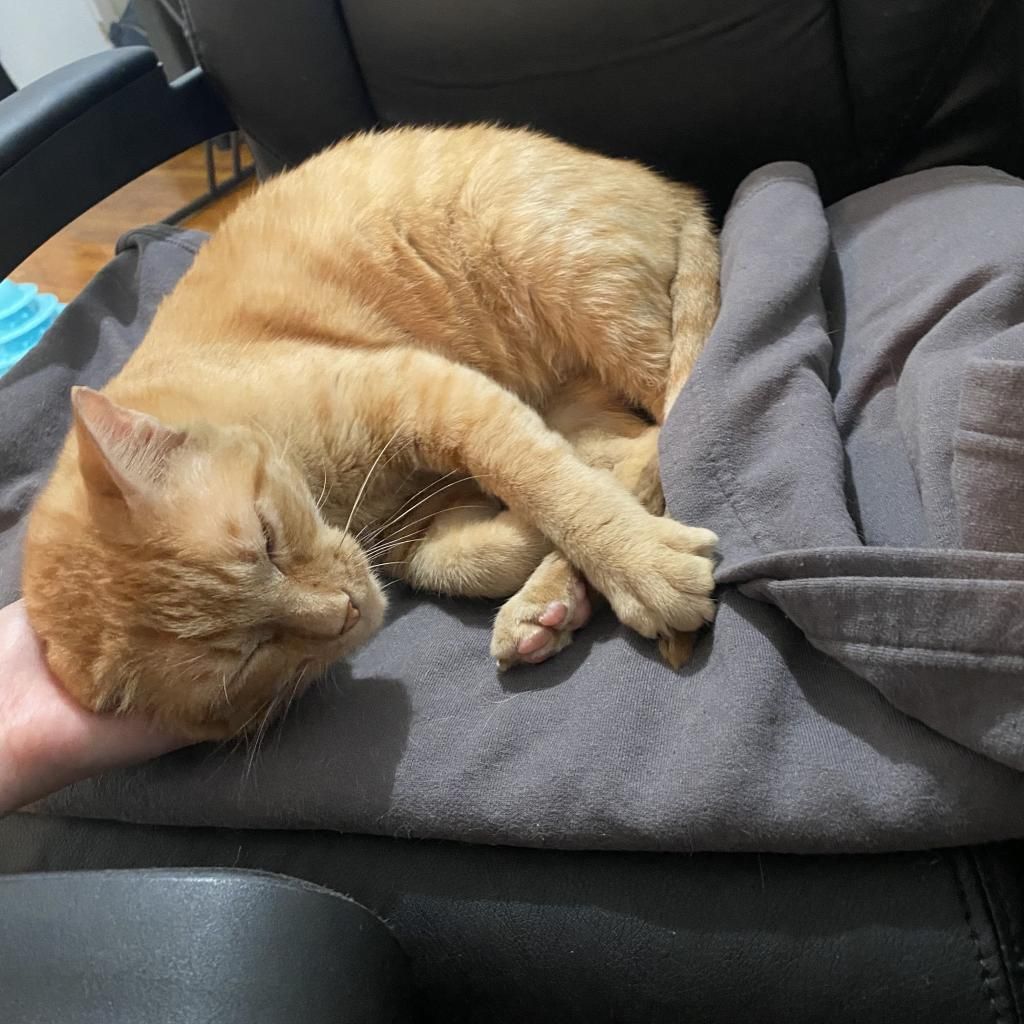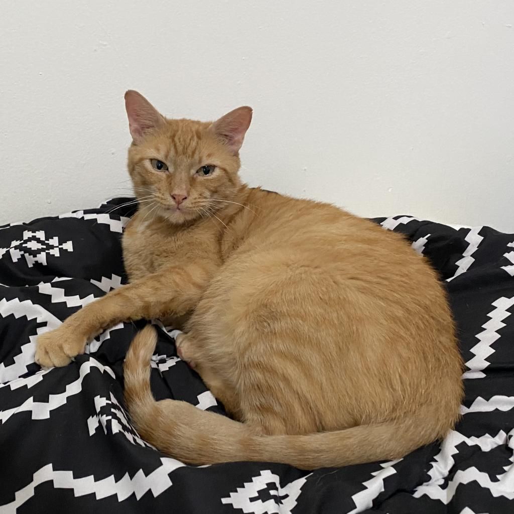 Introducing Mogli, a vibrant 4-year-old male orange tabby! Mogli is bright and sunny with a playful and energetic personality that's sure to bring joy to any household. He loves to chase toys, explore new spaces, and bask in the warmth of the sun streaming through the window. Despite his playful nature, Mogli also enjoys quiet moments of affection and will happily snuggle up with you for cuddles and pets. He is curious, relaxed, quite vocal when he wants something, and affectionate. He likes to play with toys that emulate hunting. He goes bonkers over a stick and string toy with some bait on the end and is fascinated by movement like fans and blowing air. He likes to squeeze himself into tight spaces. He likes to chat, and is a wonderful companion. Mogli loves both to play and receive pets. He will play by himself but also likes you to be involved. He also loves being pet and will come sit next to you or follow you around to ask for pets. He is a loyal and constant companion, you could not ask for a better friend.