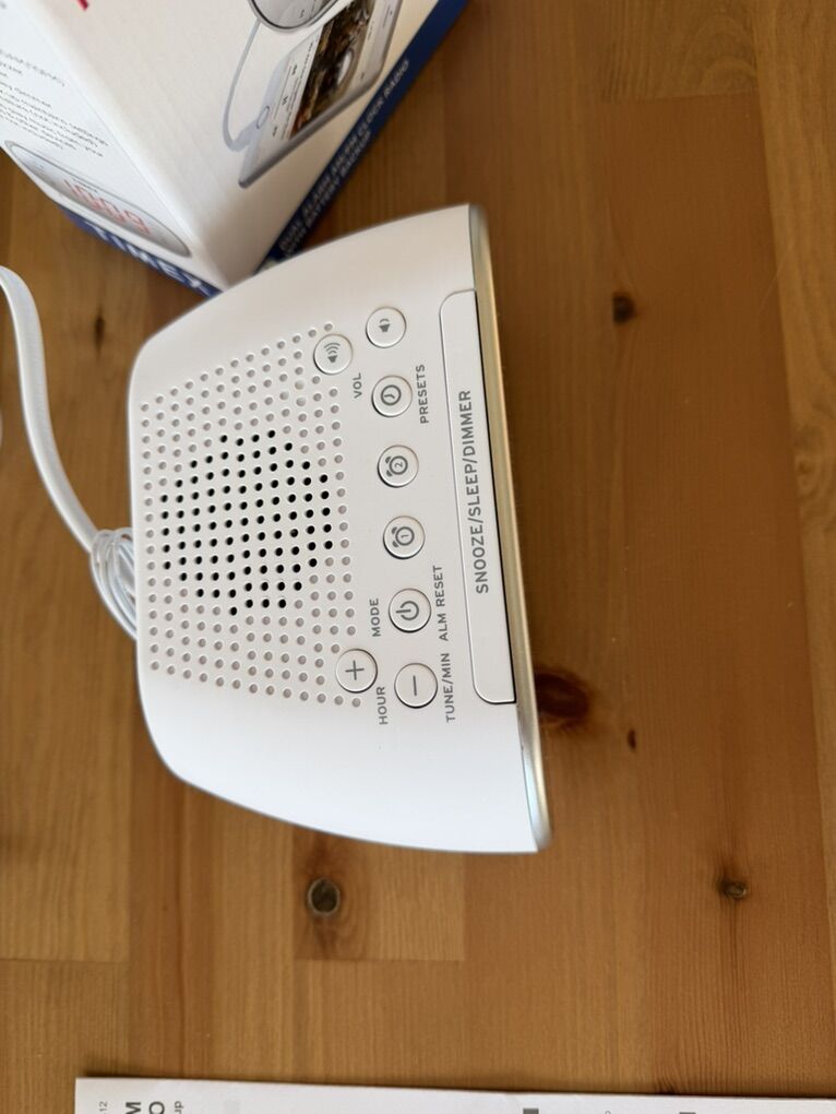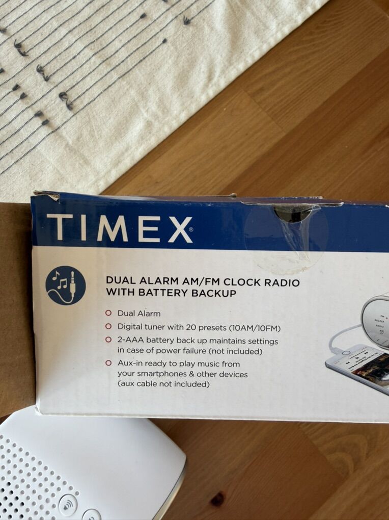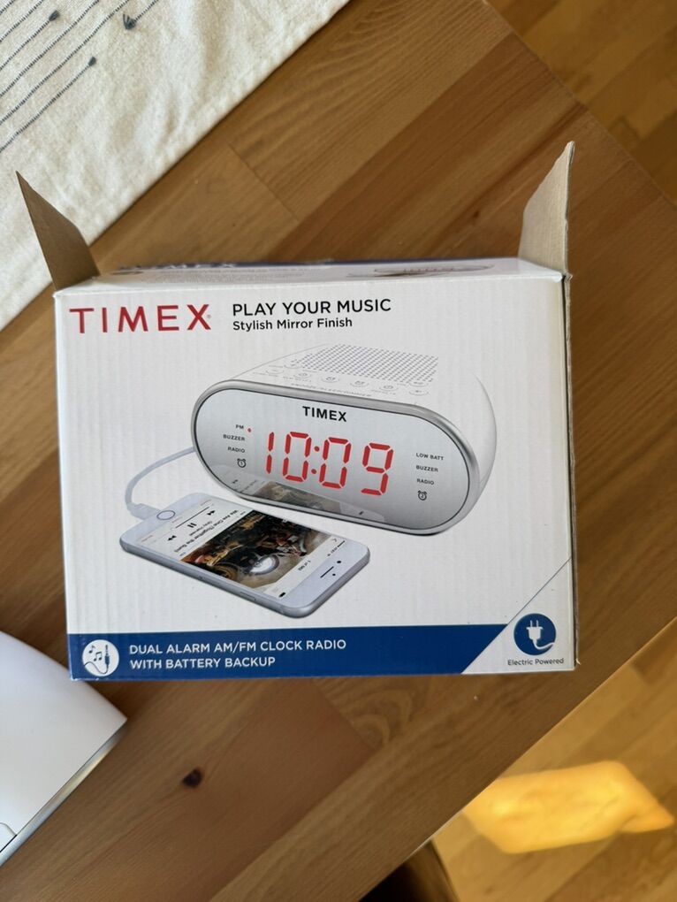 VenmoWhite timex alarm clock radio with mirrored finish. Can play music from your phone. Electric powered with battery backup.