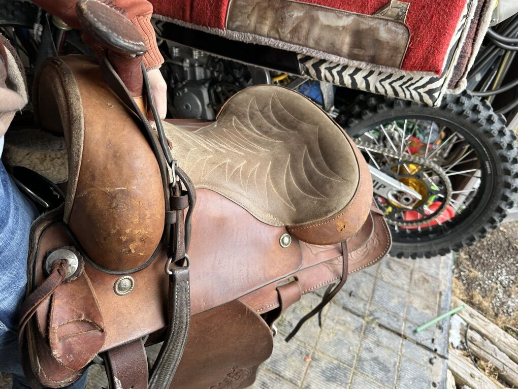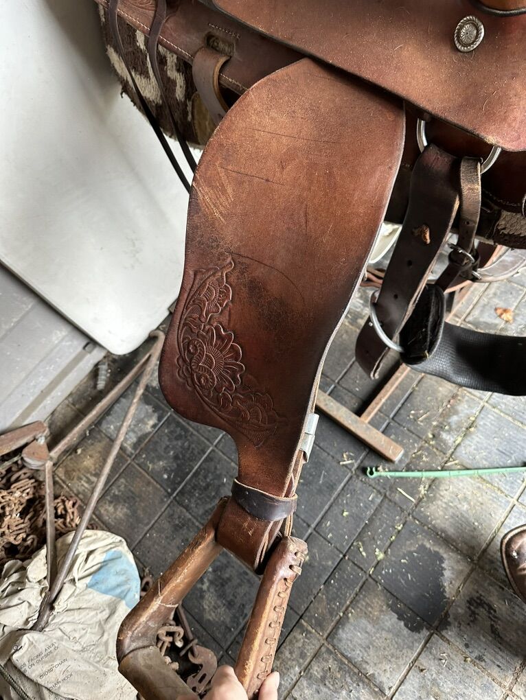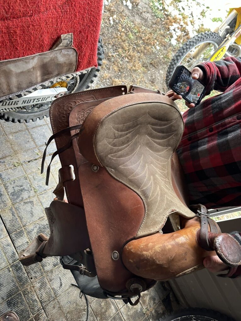 In good condition leather needs a little oil but in good shape tree is solid no brand on it anywhere it’s a 14 inch seat comes with back cinch breast collar and front cinch in decent condition cross posted to Facebook no hold