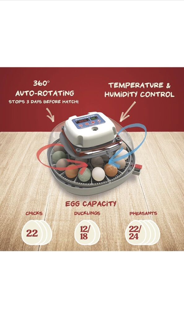 FOR CHICKENS, DUCKS & PHEASANTS: This incubator for hatching eggs can hold up to 22 chicken eggs, 12-18 duck eggs and 22-24 pheasant eggs; with an automatic egg turner, temperature and humidity control, hatching eggs has never been easier.