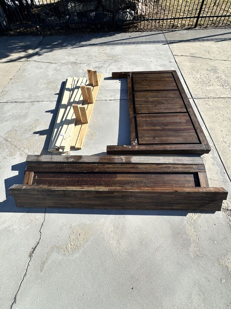 ZelleAs-Is California king frame - includes headboard, side boards, end board, and the mattress supports.