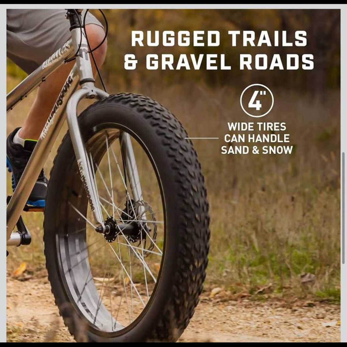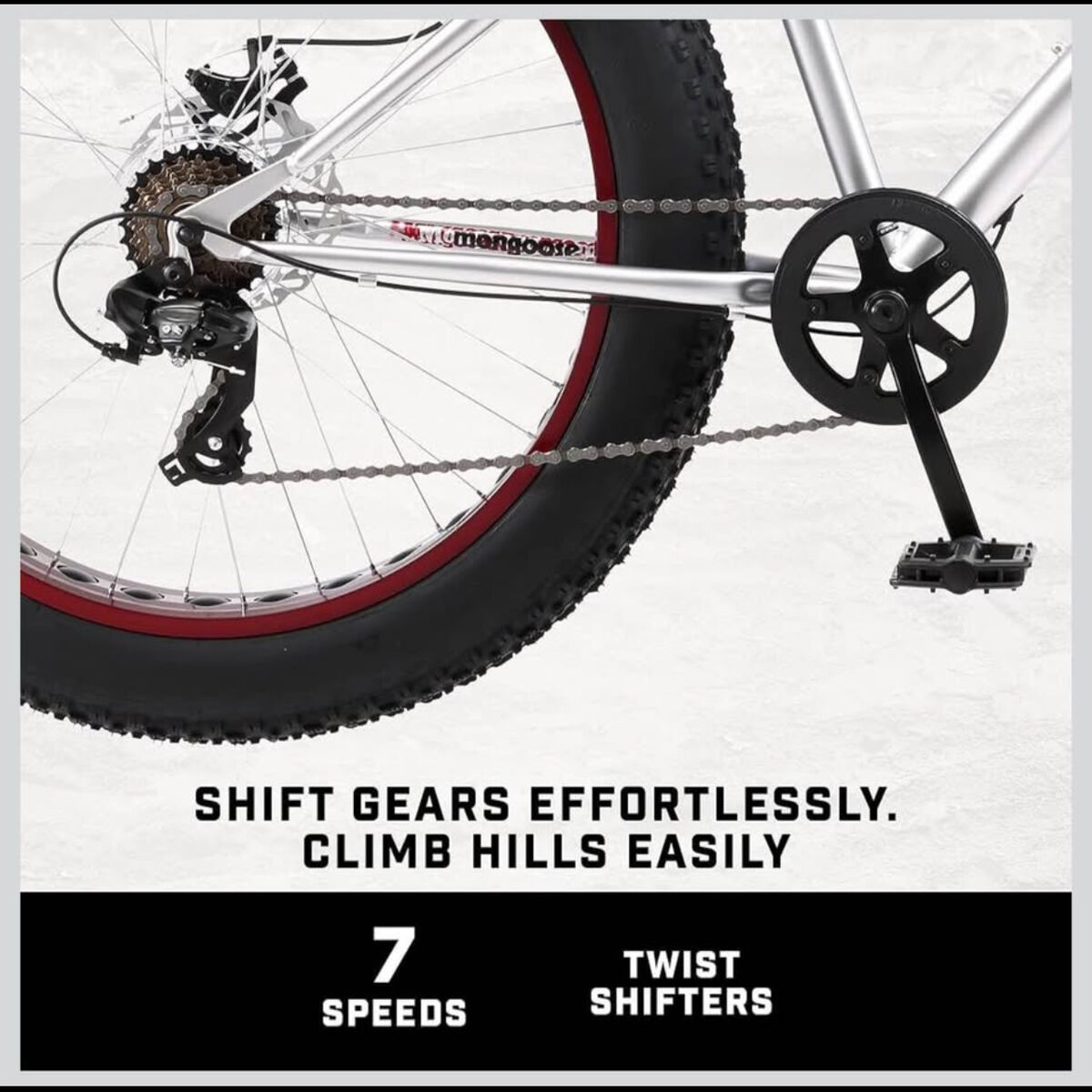 Mongoose Malus Mens and Women Fat Tire Mountain Bike, 26-Inch Bicycle Wheels, 4-Inch Wide Knobby Tires, Steel Frame, 7 Speed Drivetrain, Shimano Rear Derailleur, Disc Brakes