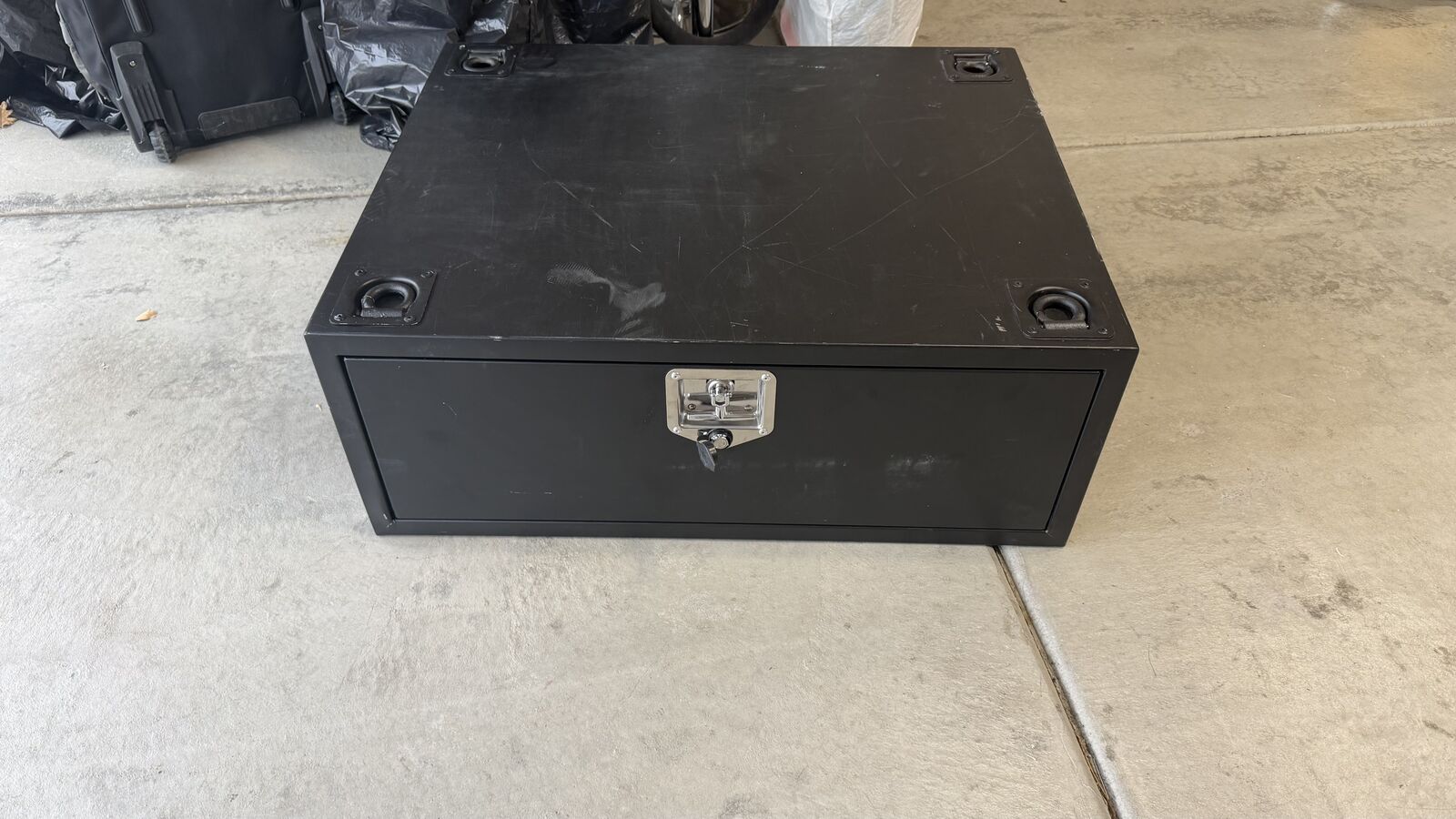 ApplePayThis strong box I had in the back of my Rubicon to secure equipment. Heavy duty drawer slides extend fullly. Key included. has bolt holes for the bottom, and strong tie downs on the top.