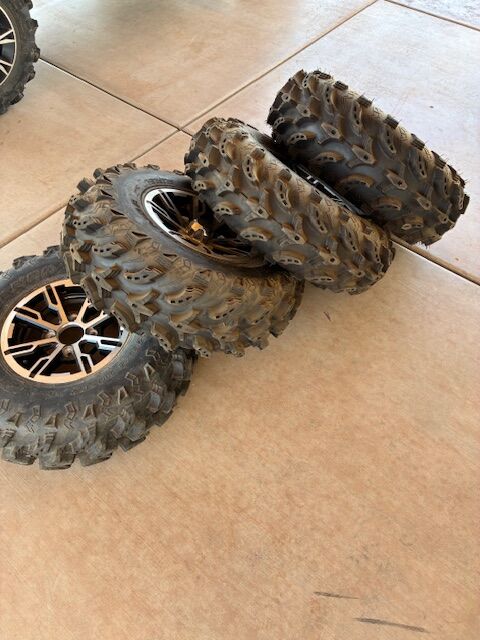 UTV rims and tires (4). Rim/Tire specs: AT26 x 9.00 - 12. Almost no wear on new tires.