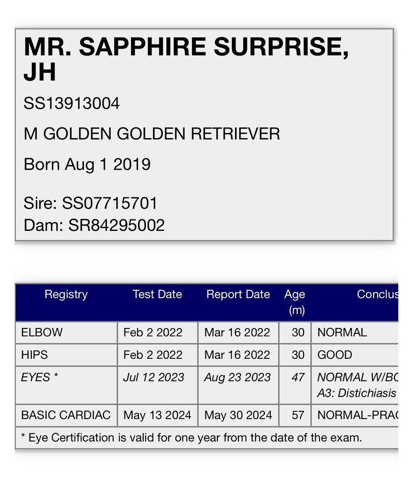 ApplePayFinn is so majestic with his beautiful, blocky head and dark Golden fur. Finn weighs about 75lbs. He is the type of dog who will do anything for you. Finn is even-tempered and has an air of confidence about him. We absolutely love him! Finns father was a champion cream from the Ukraine and his mother was a gorgeous copper American golden with some field competition experience. Finn has proven his intelligence in hunt test competitions and had his junior title before he was 2 years old. He’s perfectly obedient as well. To sum it up...Finn is the perfect combination of an all around golden. He loves children, other dogs and has such a strong desire to please. If you hunt or compete, he marks a fallen bird like a laser and runs like lightning to retrieve and bring the bird right back. You don’t want to miss out on the beauty and intelligence that Finn has to offer your future litter of pups. All health testing has been done including OFAs and genetic testing. Call or text if interested in using him as your next STUD!