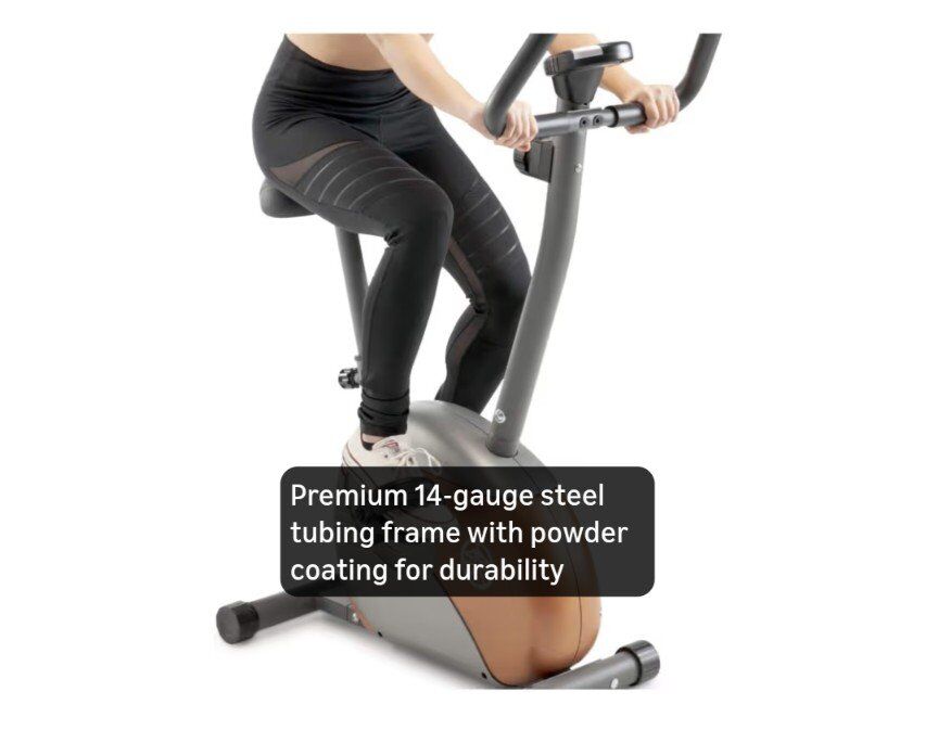 PREMIUM STEEL CONSTRUCTION – This stationary upright bike features a premium frame of 14-gauge steel tubing, finished with powder coating that combines design and performance. It boasts both functionality and durability.