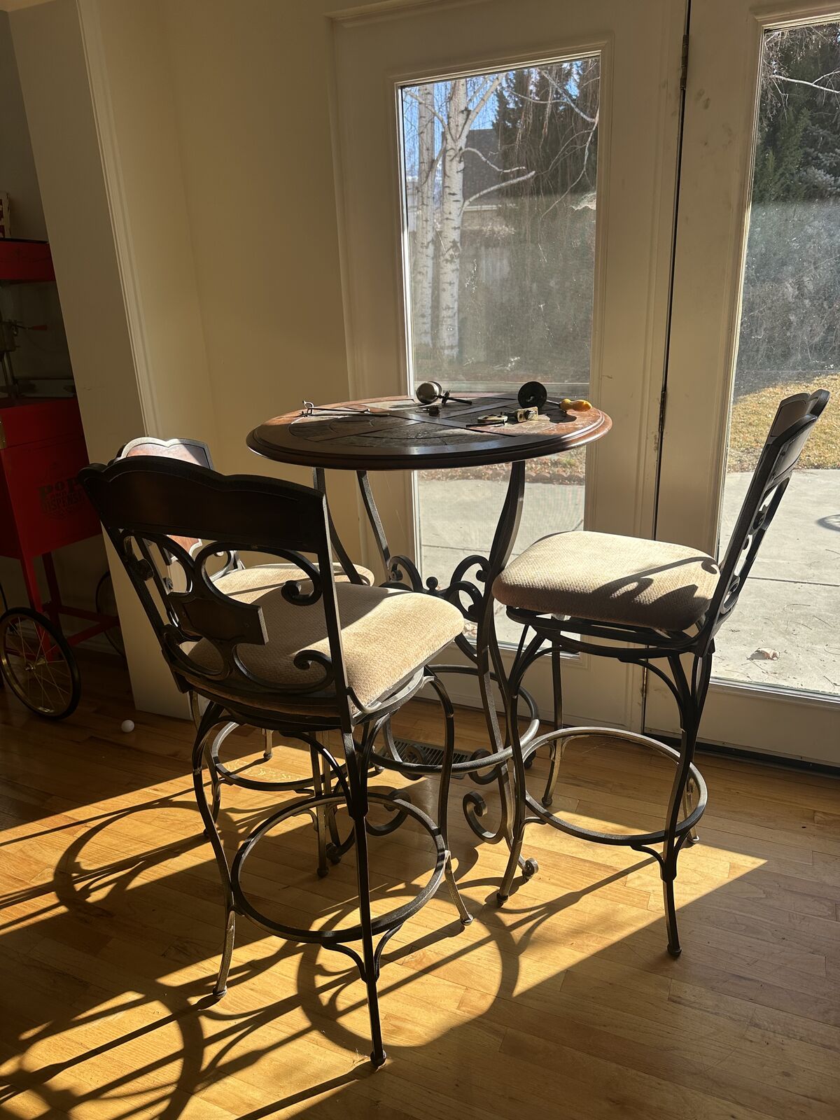 VenmoUsed dining room table that is bowing in the middle. 8 upholsteted chairs that are pretey stained. Bar table and some bar stools.