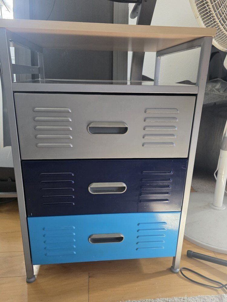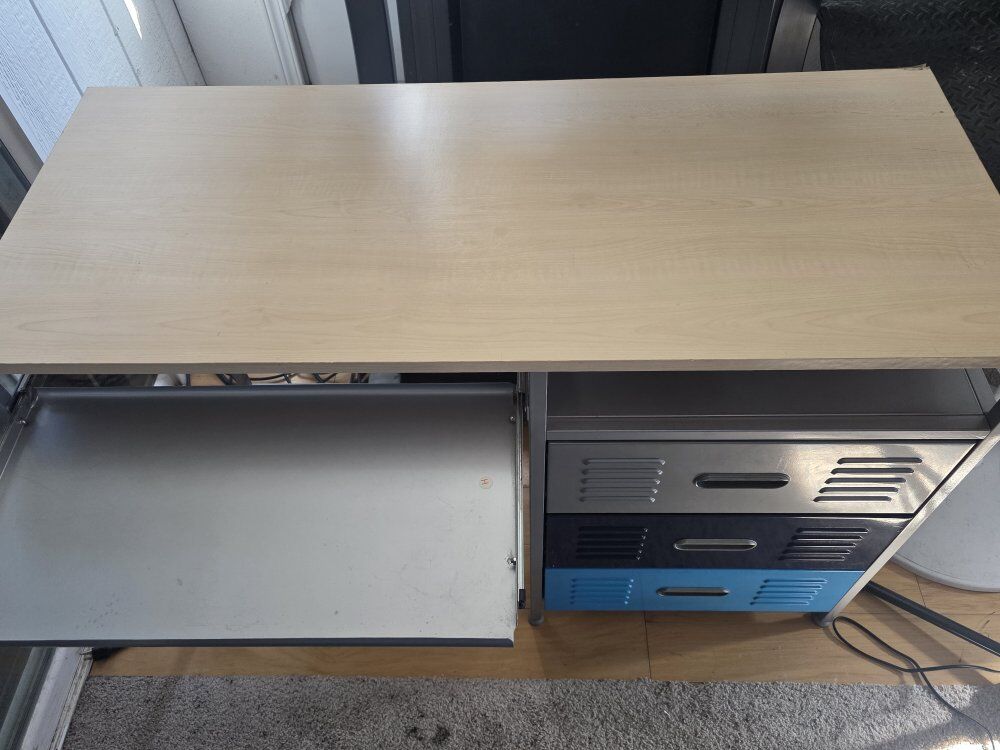 VenmoThis desk features a pullout keyboard tray and 3 locker-style drawers. Has a little damage as shown in picture but other than that is in good condition. 3'x10" Long 1'x8" Wide 2'x8" Tall