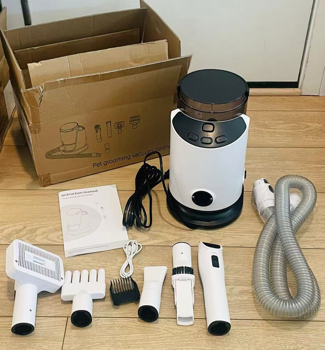 Zelle3 in 1 Home Groomer! These dog grooming kit allows you to dry, clip, and vacuum your pet's hair in one go. Plus, you can groom pets at home now! Save tons of money and time. Strong Dog Grooming Vacuum: Features a powerful 12000PA suction motor to effortlessly suck away hair, dirt, dander, and fleas from your dog. No More Flying Fur: The removed loose hair will be sucked into the Canister directly while trimming. Adjustable Comb is perfect for pets of all hair lengths. Dog Hair Dryer: Equipped with 3 temperature settings (95⁰F - 131⁰F), 3 airflow speeds, and 2 blow nozzles, you can easily dry your pet's fur and keep it fluffy. 3L Canister For Large Dog: Other's 1L canister requires 2-3 times empty for one grooming, our 3L canister eliminates the need for frequent emptying Quite, Soft Grooming: New noise reduction technology eases pet grooming anxiety and provides your pet cozy and relaxing experience.