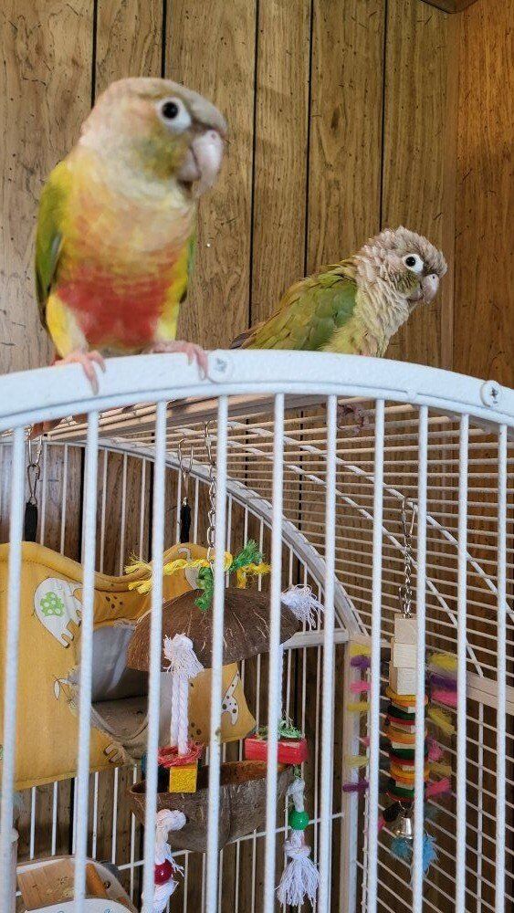 peach and pineapple conure bonded pair, comes with cage and all there belongings.