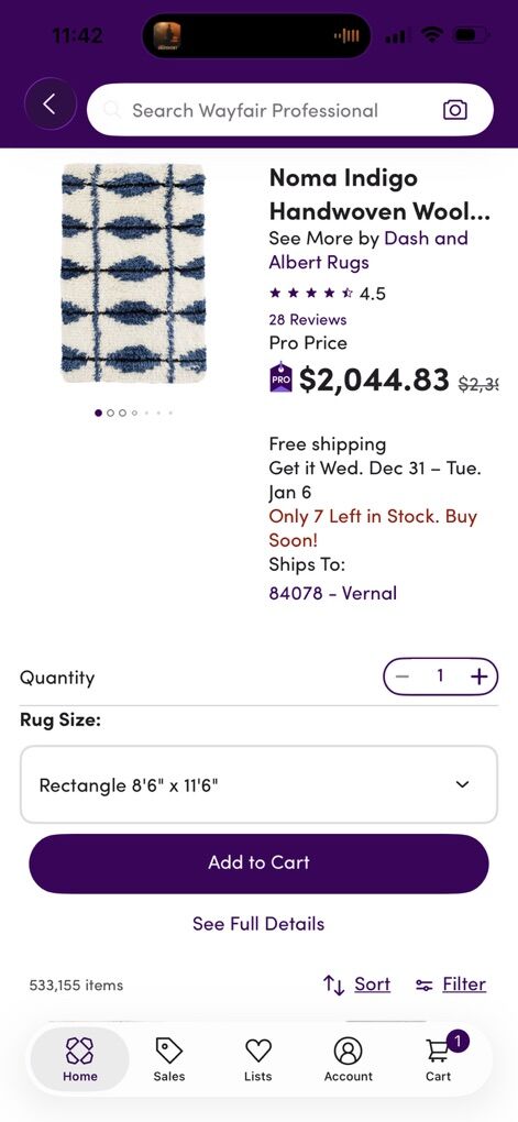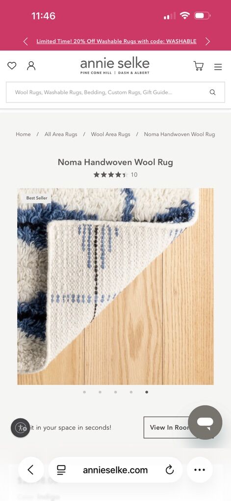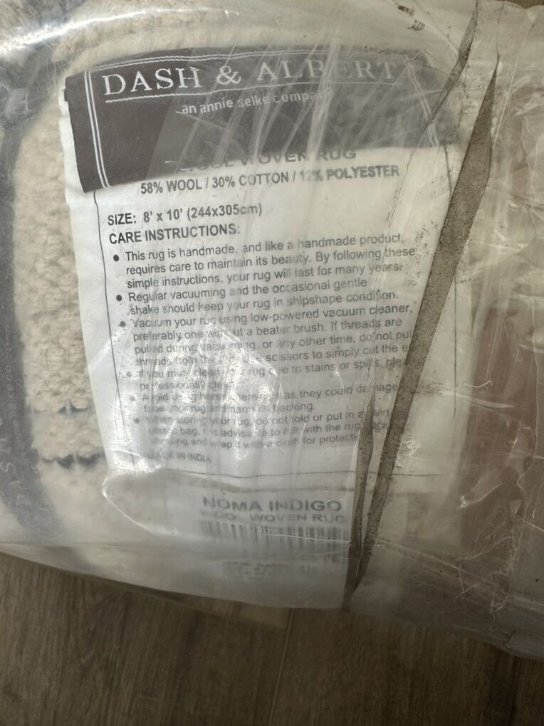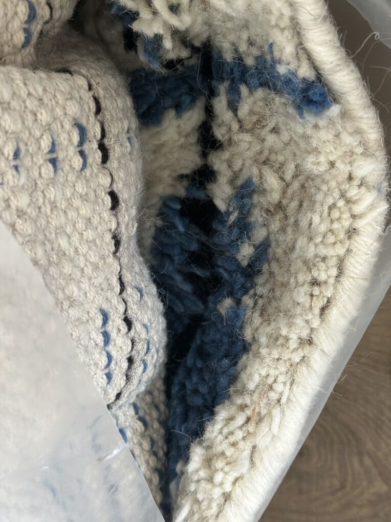 Beautiful handwoven wool rug with a blue and white pattern. The rug is made of high-quality wool and has a unique, handcrafted design. It is 58% wool 30% cotton and 12% polyester rug size is 8 x 10.