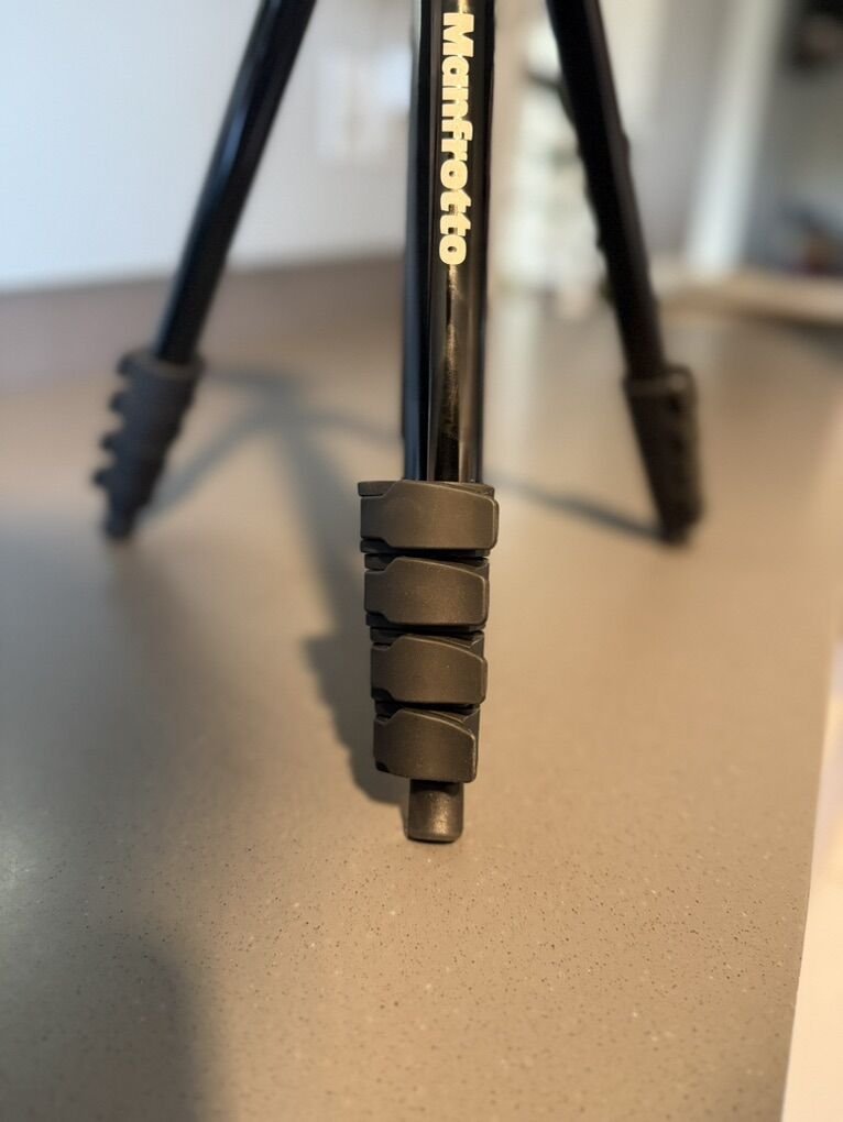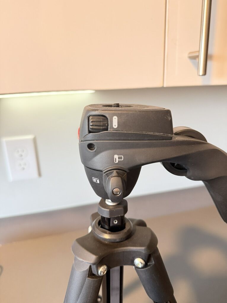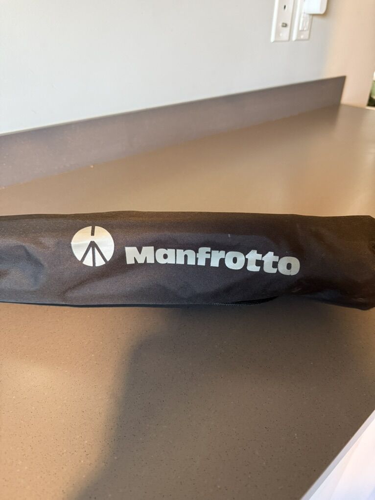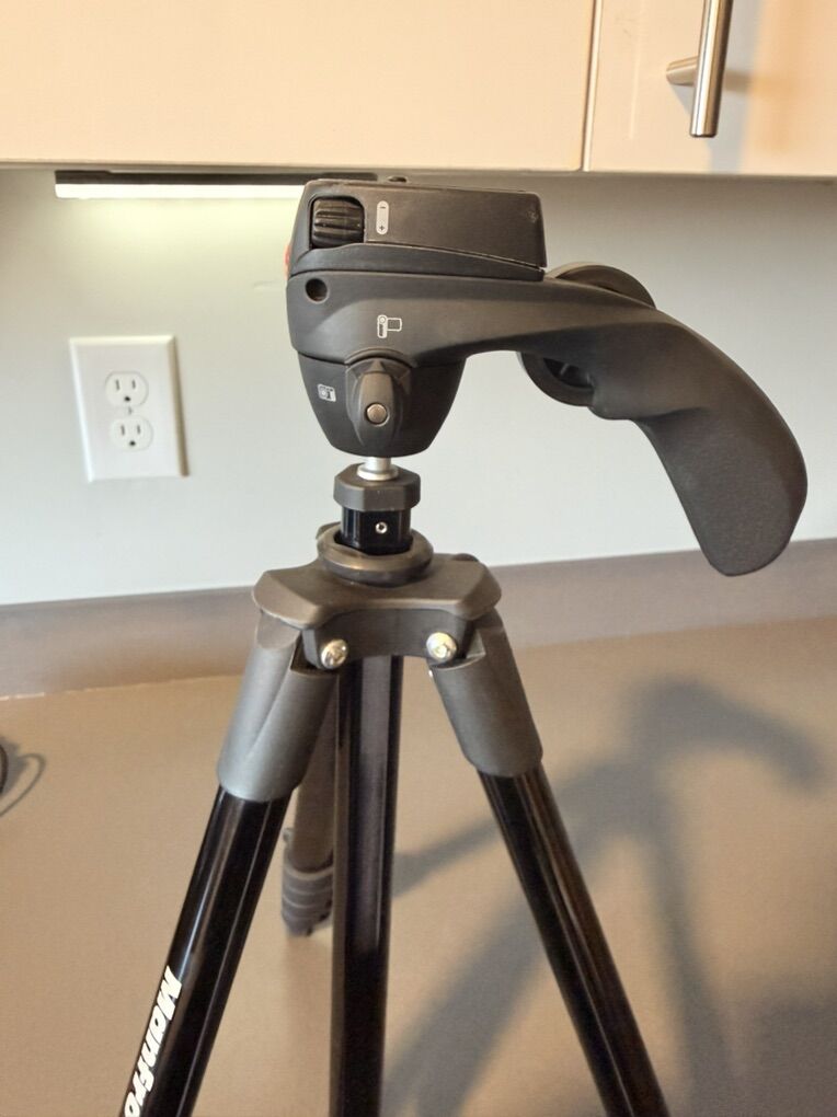 VenmoManfrotto Camera Tripod with Quick-Release Plate – Excellent Condition This tripod features a quick-release mounting system, allowing you to screw the plate into your camera and easily lock it into the tripod head for fast setup and removal.