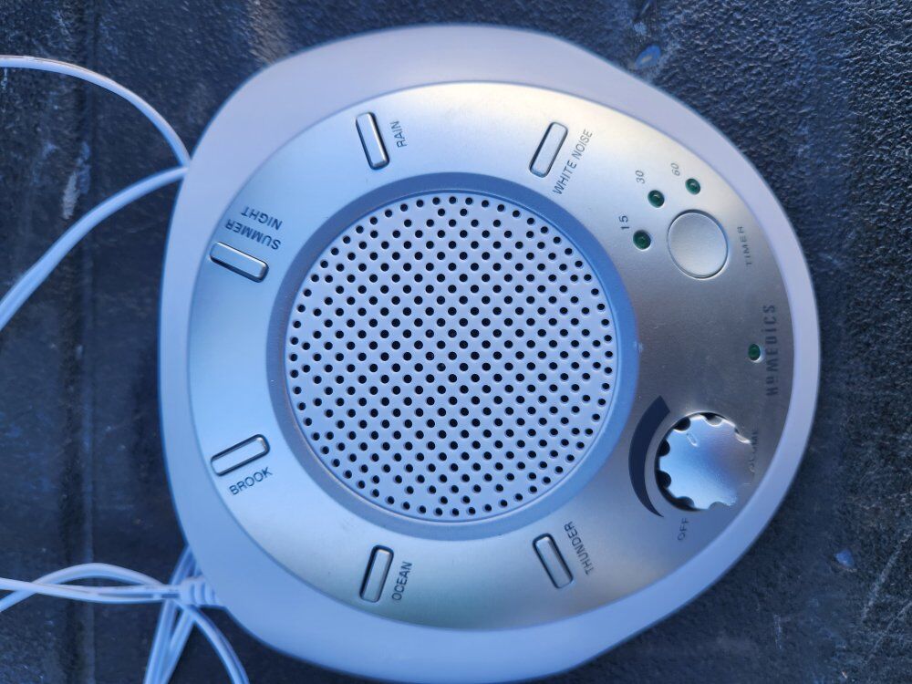 HoMedics SoundSpa white noise sound machine. It features six digitally recorded, calming sounds: White Noise, Thunder, Ocean, Rain, Summer Night, and Brook. The machine can be powered by an AC adapter or batteries for portability. It includes an auto-off timer with options for 15, 30, or 60 minutes, or continuous use. The device is designed to help mask external noises to aid relaxation, sleep, work, or study.