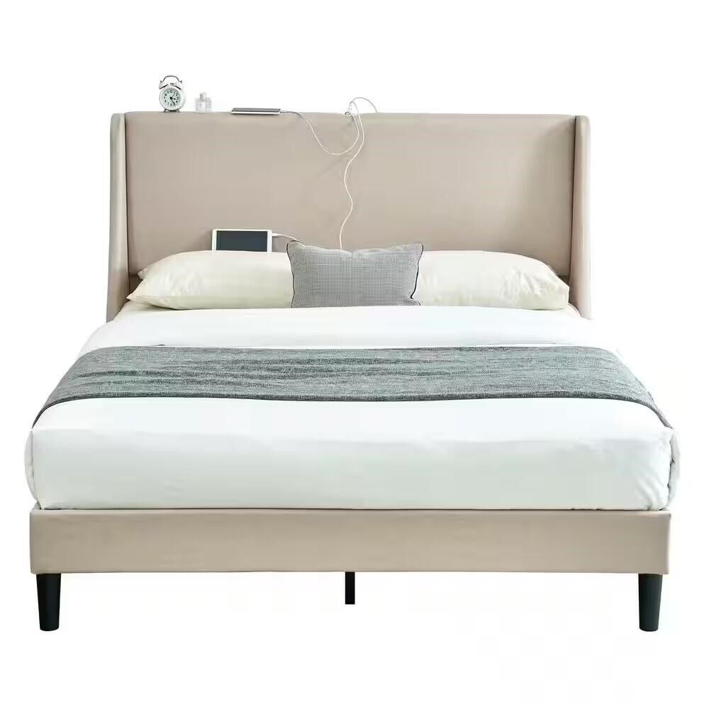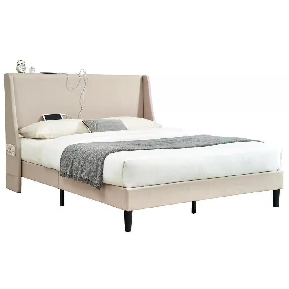 PayPalVECELO Upholstered Bed Frame with USB-C Ports Full, Beige New Factory Sealed