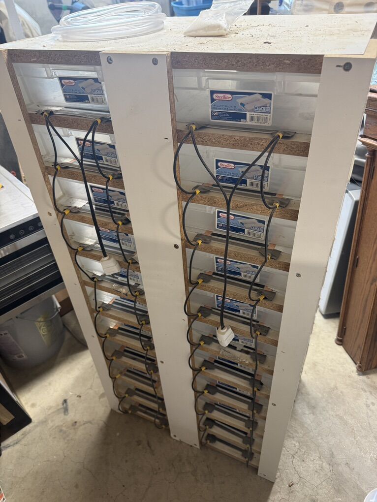 VenmoReptile rack with heat tape, good size for ball python hatchlings Rack: 22 3/4”w x 15”d x 44 1/4”h Tubs: 10 1/2”w x 14”d x 3”h