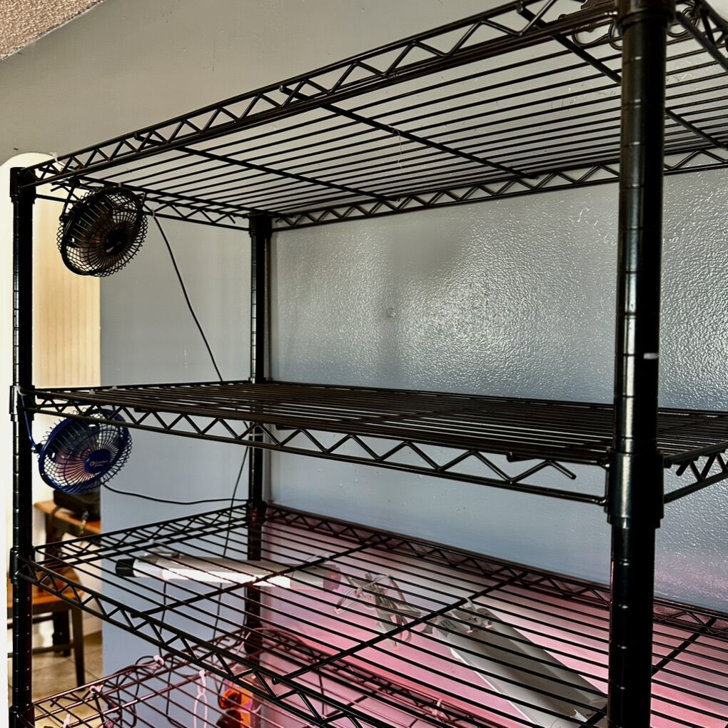 • Four full‑spectrum LED grow lights • Four clip‑on circulation fans • All five wire shelves (one shown separately) • Power cord not included (orange cord in photo is not part of the sale)