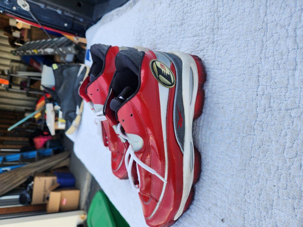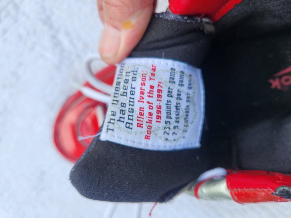 Reebok Answer DMX 10 "All-Star". This specific colorway, featuring a red patent leather upper, was a tenth-anniversary release that originally came out in 2013. The style is known for commemorating Allen Iverson's legacy and incorporates the brand's signature DMX moving-air cushioning technology for comfort and support. Key Features Colorway: Excellent Red/White/Pure Silver Material: Tumbled and patent leather upper with a rubber sole Technology: Features DMX 10 moving air cushioning, which transfers air throughout chambers in the sole for adaptive support Design: Mid-top basketball shoe with a distinctive split design over the laces and Iverson's "I3" logo on the side .
