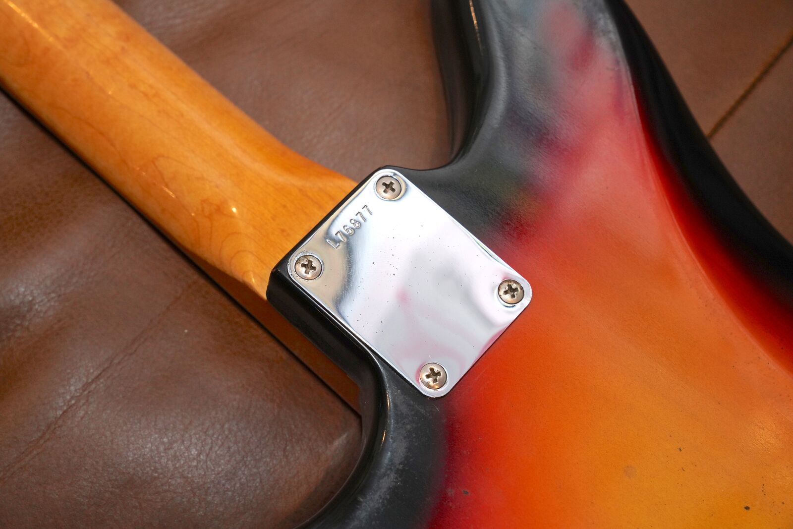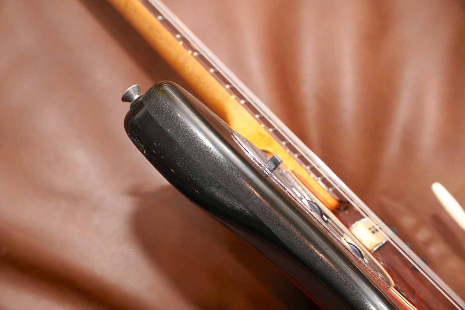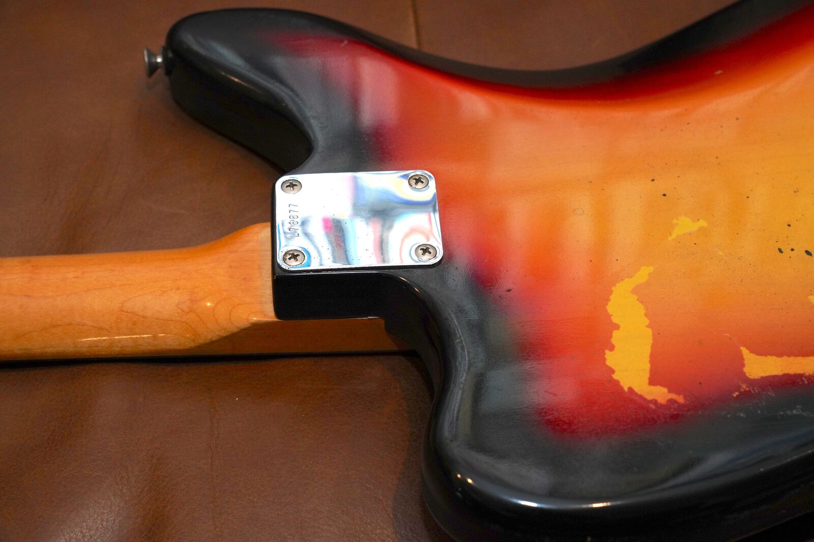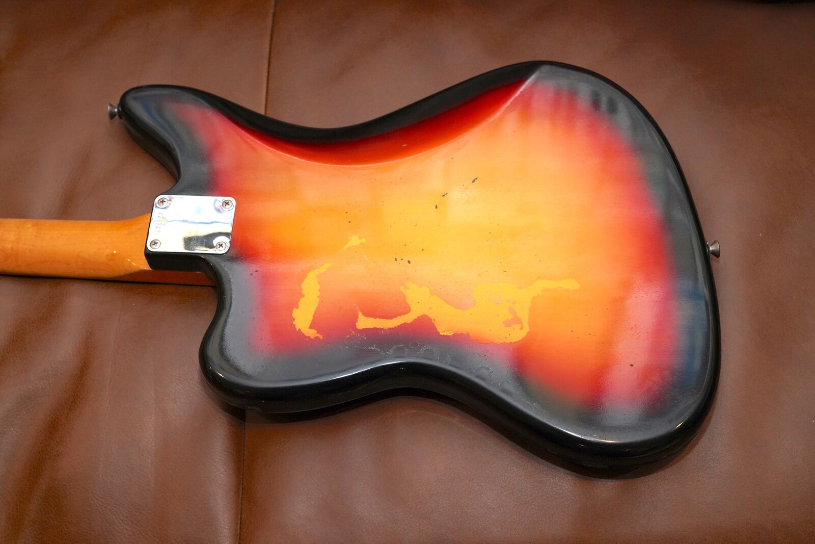 Also includes the original Parker Bodyguard Plastic protector that was available in the 60s and 70s for most Fender guitars. This guitar clearly had the Parker Bodyguard on it for a good long while, and there is an area on the back where the finish has worn away from it being on there, also along the sides of the guitar you can see where the foam from the plastic cover reacted with the finish. From the front you don't notice it, and honestly I'd rather have the original finish like this as opposed to some goofy refinish.