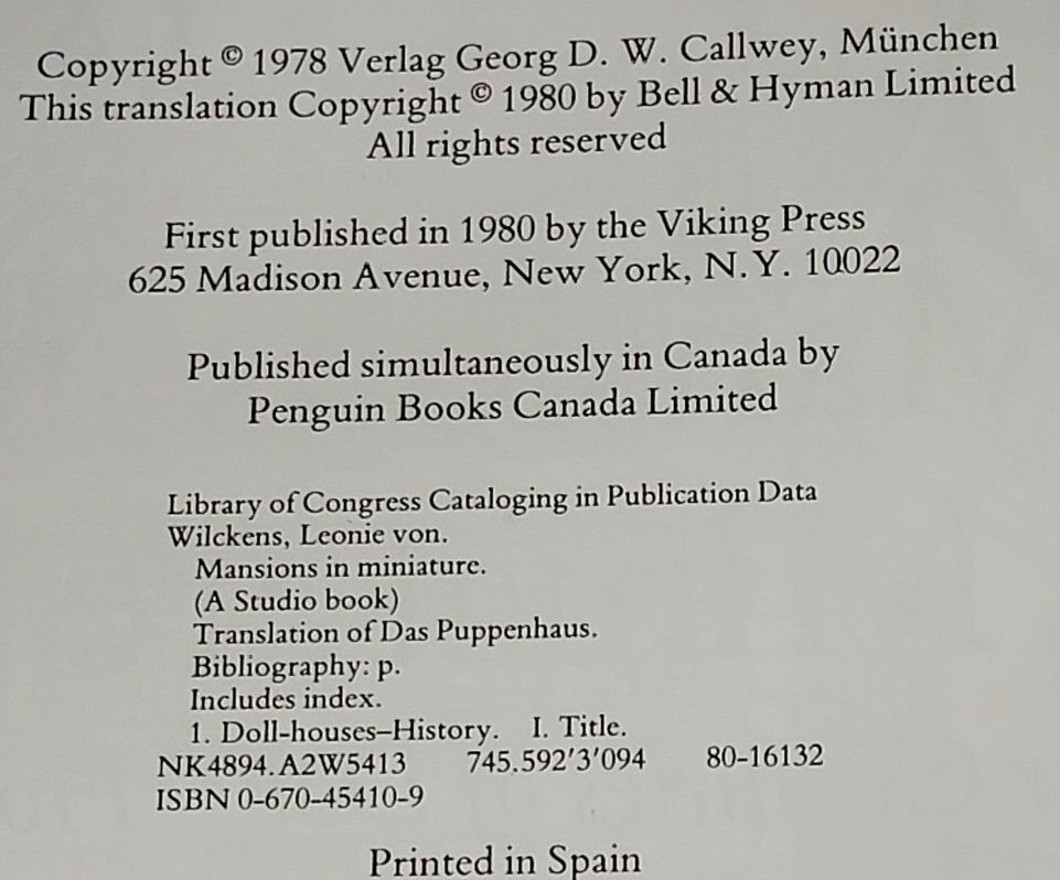 A Mansions in Miniature book, "Four Centuries of Dolls Houses" by Leonie Von Wilkens, 1978. Nice large Hardcover Book in excellent condition with both colored and black & white pictures. Please text or message me with any questions, thanks