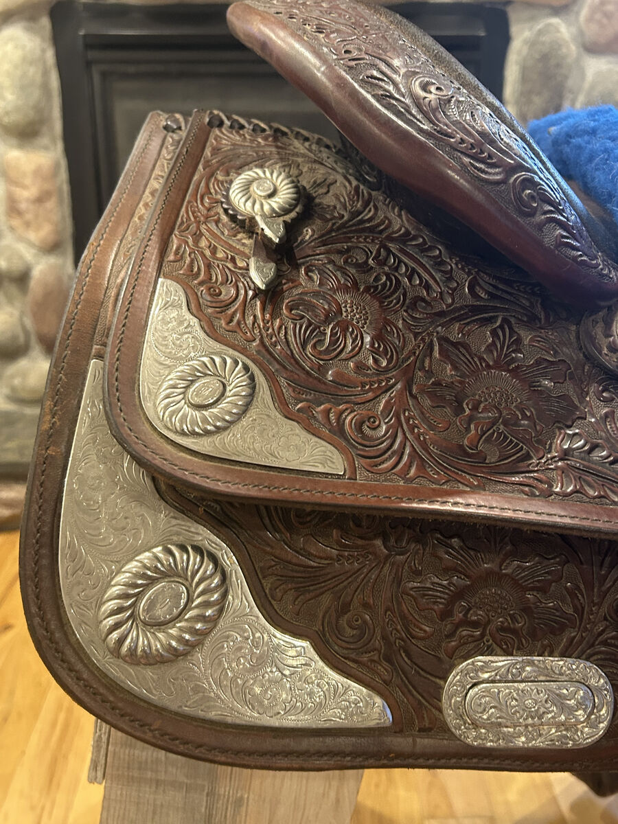 This saddle has a 16" padded rough-out seat, tooled metal details on the skirting and beautiful floral tooling detail throughout. The gullet measures 8" across and the sheepskin is in impeccable condition. The stirrup leathers are pre-turned.