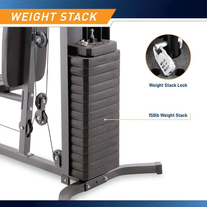 VenmoGet a wide variety of strength training exercises with the Marcy Pro 150 lb Stack Home Gym Machine MWM-4965SC to effectively burn calories and increase your muscle mass! Throw out your gym club membership and save money with this high quality piece of equipment. The workout stations on the MWM-4965SC allow you to target multiple muscle groups with one piece of workout equipment. Use the dual-action press arms and upper pulley cable to work out your upper body. The lat bar will prepare you to move on to a pull-up bar, and the ab attachment will strengthen your core. The efficient and space saving design allows the user to quickly get a full body workout with the convenience of working out at home. With this all in one home weight machine, you could put away your free weights and avoid the clutter. The MWM-4965SC Weight Stack Home Gym includes adjustable weight plates and provides different pounds of resistance depending on the station used. See page 16 of the MWM-4965SC Manual to see how much resistance is possible on each station of this cable machine.