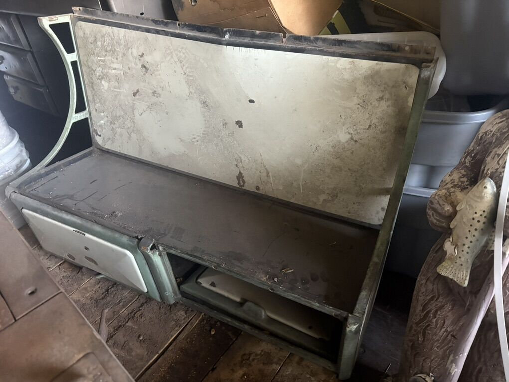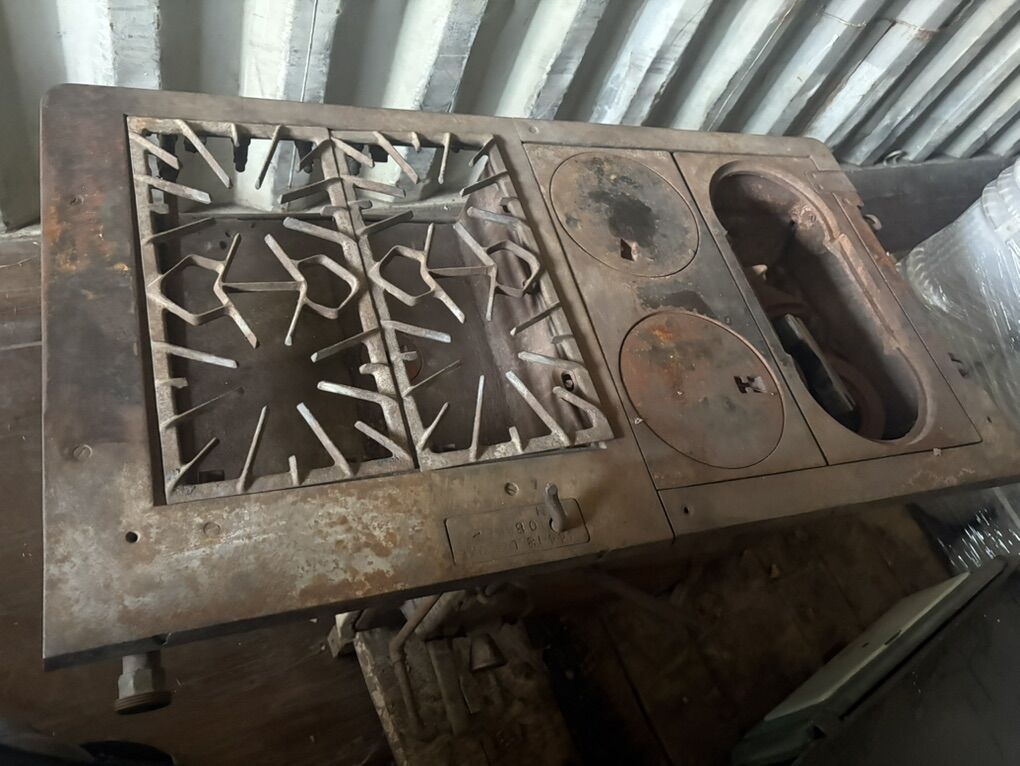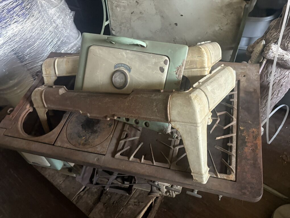 VenmoOrbon antique cast- iron wood stove with wood box and gas burner top. Heavy, solid piece with original grates, plates, and hardware. Needs full restoration, has some damaged parts, but great for decor, parts, or restoration.