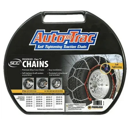 Peerless Chain Company Auto-Trac Passenger Chain, 0155310 Peerless Chain Auto-Trac Passenger Tire chain, 0155310: Worry-free ratchets that automatically tighten and center the chain on the tire Superior traction performance Snow tire chain are easy to install and remove Built to last For a wide variety of passenger tire sizes Meet Class "S" clearance requirements Connect the cable, attach the 2 self-tighteners and drive Dual high-impact polycarbonate self-tightening ratchets eliminate loose chain and re-tightening stops Diamond pattern cross chain provides a smoother ride These passenger car tire chain include convenient and easy-to-use carrying case.