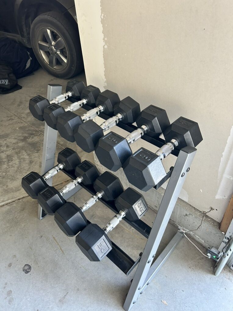 PayPalThis set of dumbbells has pairs of 10#, 15#, 20#, 25# & 30# along with the rack. These have been well taken care of and in great condition.