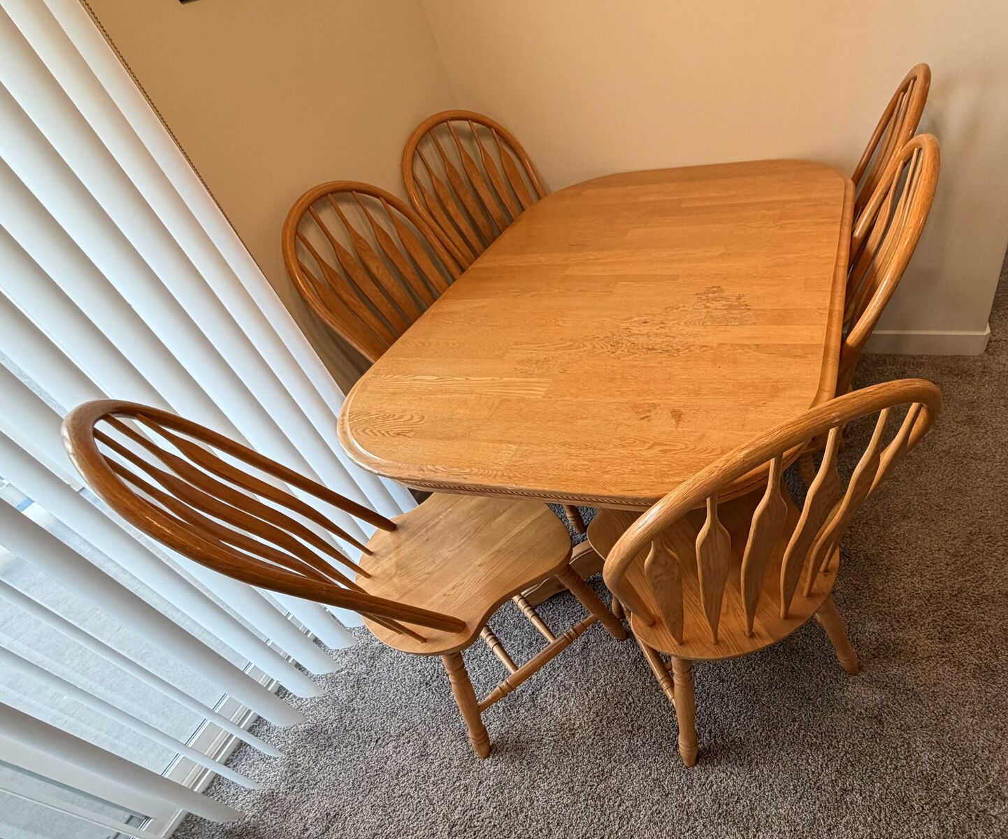 ZelleBeautiful solid wood dining table with six matching chairs and two removable leaves, allowing the table to comfortably seat up to 10 people when fully extended. Part of a matching solid wood set — coffee table and end tables available. See my other listings for coordinating pieces. Features: Solid wood dining table Includes 6 matching chairs Two extension leaves for flexible sizing Seats 6 without leaves / up to 10 with both leaves Dimensions: Length (without leaves): 60 inches Width: 42.25 inches Height: 24.25 inches Extended length (with leaves): 96 inches