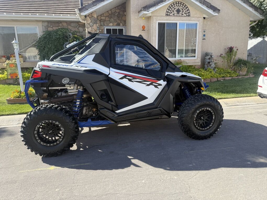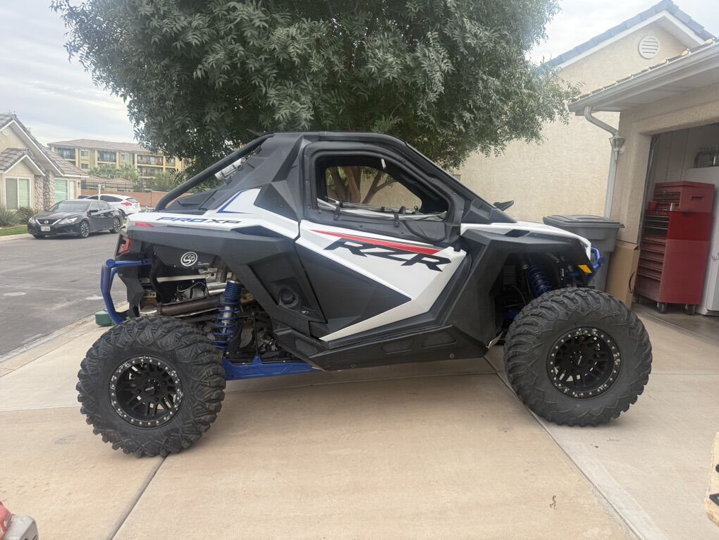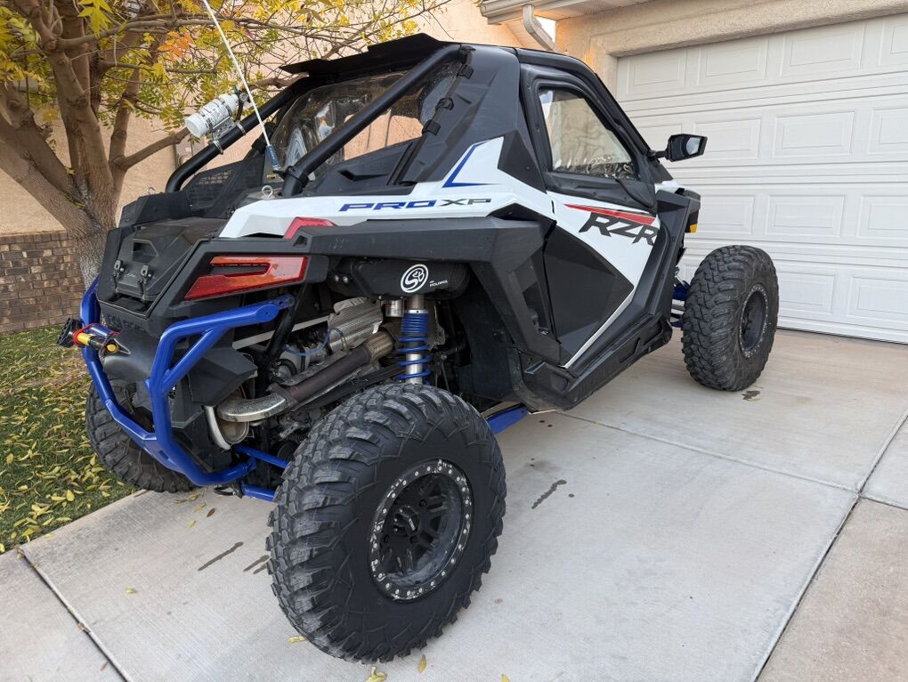 The 2020 Polaris RZR Pro XP is a 64-inch wide, 181 HP, turbocharged side-by-side featuring a 925cc ProStar engine, 96-inch wheelbase, and 14.5-inch ground clearance. Standard equipment includes Walker Evans Needle Shocks, vented 1/2 doors, 30-inch Maxxis Bighorn tires, 6-point harness-ready seats Key 2020 RZR Pro XP Standard Equipment Engine: Turbocharged 4-Stroke DOHC Twin Cylinder 925cc (181 HP). Suspension: Walker Evans 2.5 Needle Shocks (front) and 3.0 Needle Shocks (rear) with 16-position adjustability (Ultimate models feature DYNAMIX 2.0 active suspension). Drivetrain: Isolated Xtreme Performance True On-Demand AWD/2WD with heavy-duty transmission. Lighting: Signature White LED high/low headlights and red LED tail/brake lights. Interior: Bolstered bucket seats with 4-way adjustability, 6-point harness ready, and adjustable steering wheel. Storage/Cargo: 300 lb rear cargo capacity, 12-gallon fuel tank, and Lock & Ride cargo system.