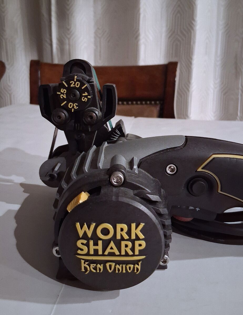 Ken Onion Work Sharp. This is the Ken Onion upgraded work sharp knife sharpener. It has the potential of additional features that the basic model doesn't include. It comes with 6 additional sharpening belts and a DVD showing the best way to use it. In very good condition.