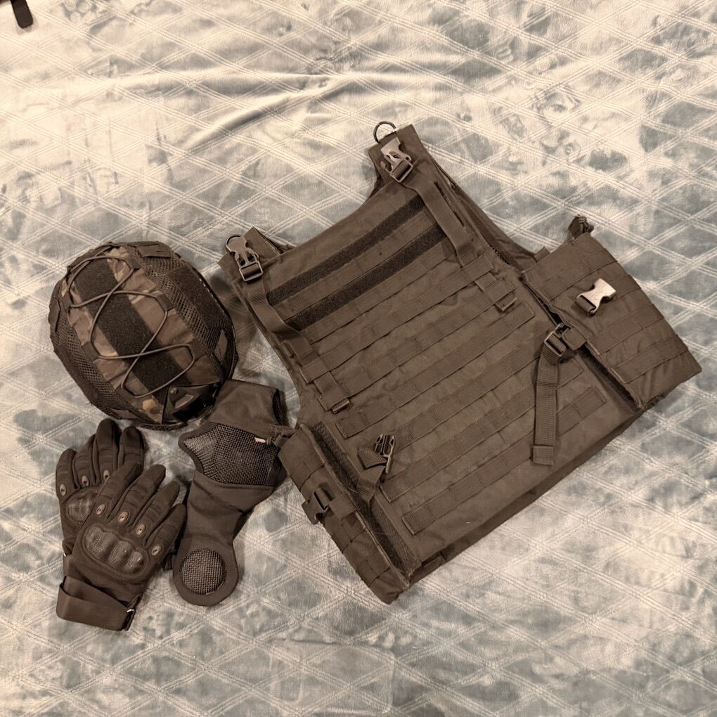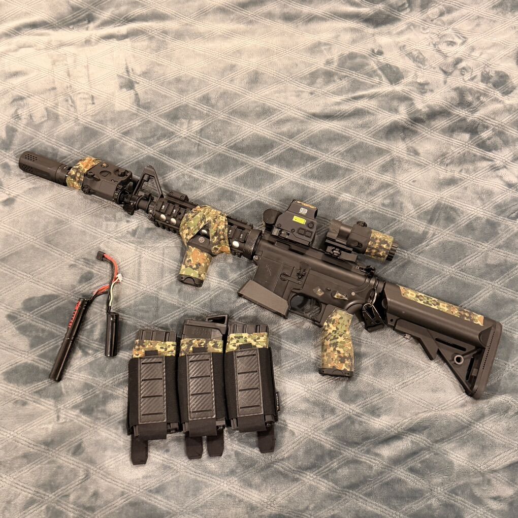 Specna Arms SA-E03 airsoft rifle, its fully functional and doesn’t have any issues comes with base gun + all accessories seen (mock Eotech EXPS3 nvg compatible, mock Eotech G33 3x magnifier, mock PEQ-15 green laser and button+flashlight nvg compatible, sling make attachment, carbon fiber 3d printed flared magwell, tracer unit, multicam GOON tape all over rifle) battery xl combat gloves helmet + helmet cover plate carrier mesh face cover triple carbon fiber mag pouch molle