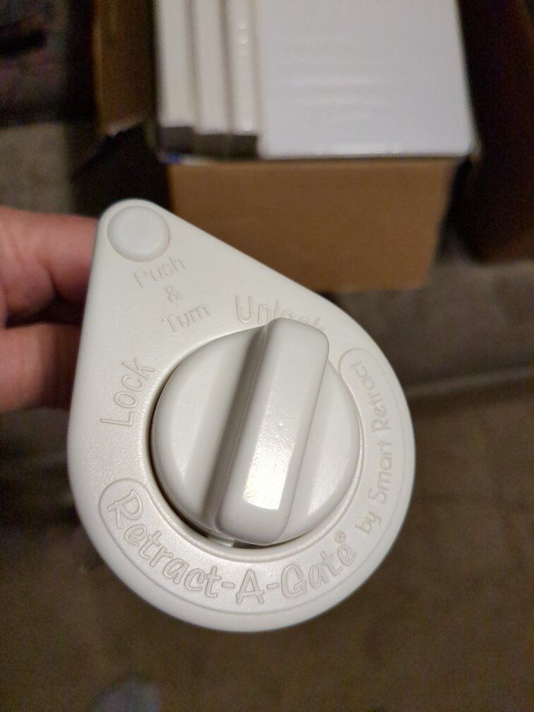 VenmoRetract-A-Gate by Smart Retractable brand locking pull-out vinyl mesh dog/child gate, 34 inches tall by 50 long. Length is adjustable to fit your opening. Excellent condition, clean and no tears or stains. Includes mounting hardware.